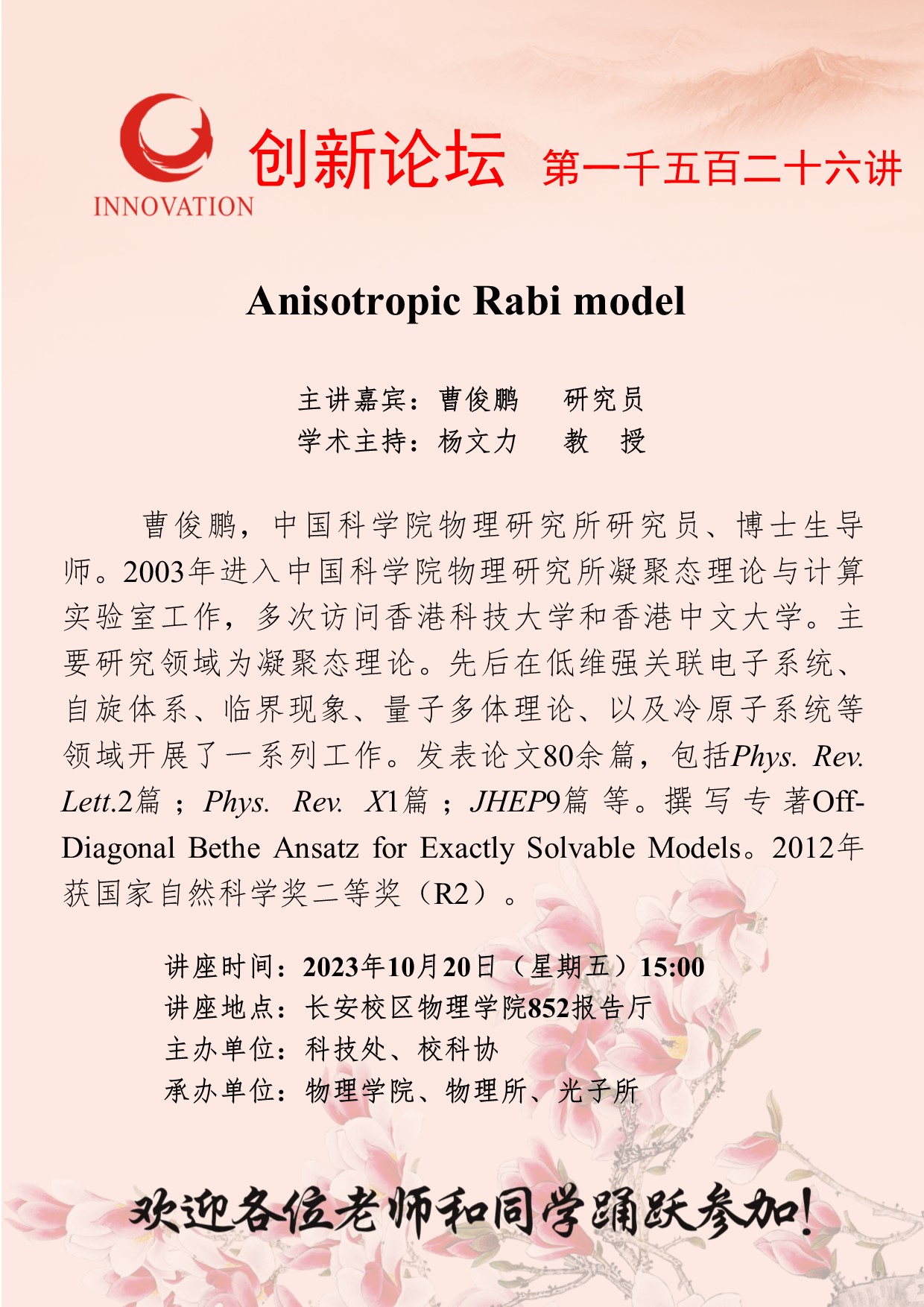 曹俊鹏 研究员 星空app官网创新论坛第一千五百二十六讲:Anisotropic Rabi model 讲座时间 2023年10月20日(星期五)15:00 讲座地点 长安校区物理学院852报告厅 讲座人介绍 曹俊鹏 研究员 讲座内容