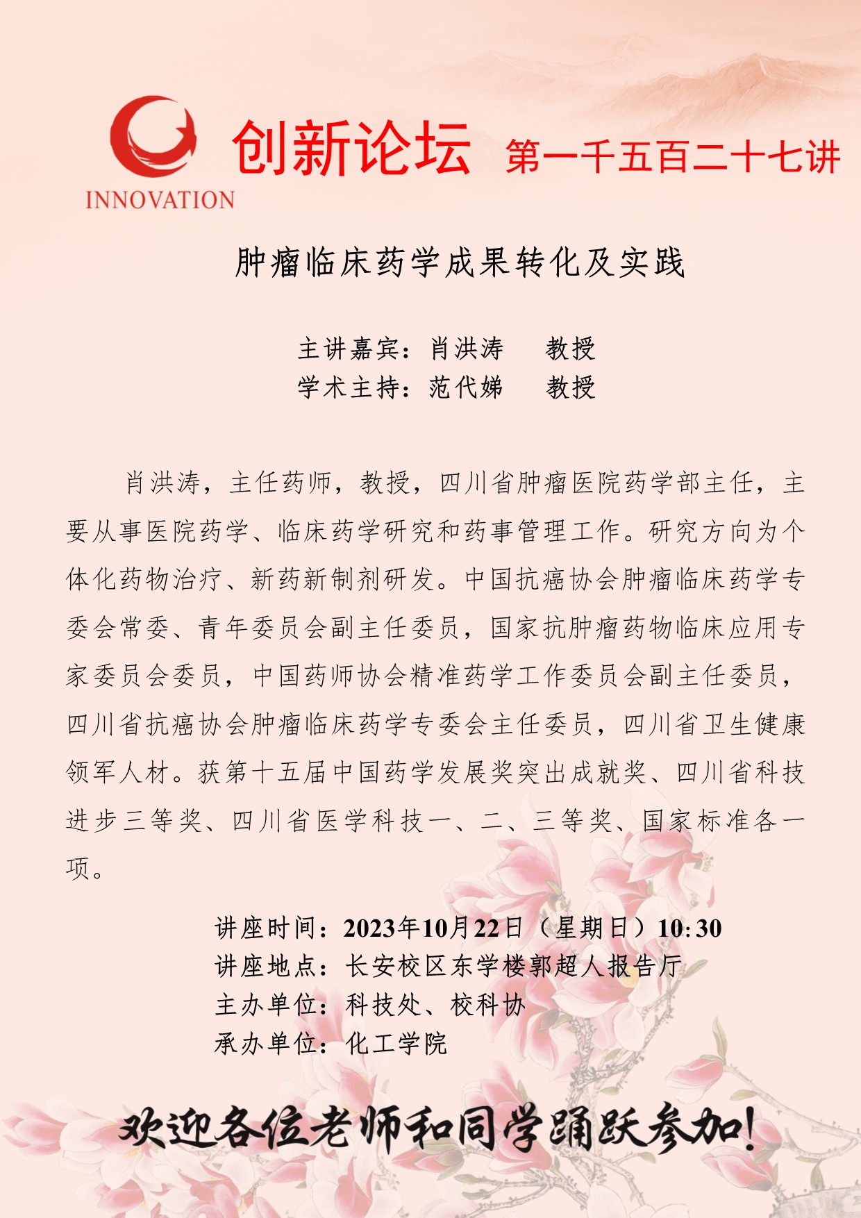 肖洪涛 教授 星空app官网创新论坛第一千五百二十七讲:肿瘤临床药学成果转化及实践 讲座时间 2023年10月22日(星期日)10:30 讲座地点 长安校区东学楼郭超人报告厅 讲座人介绍 肖洪涛 教授 讲座内容