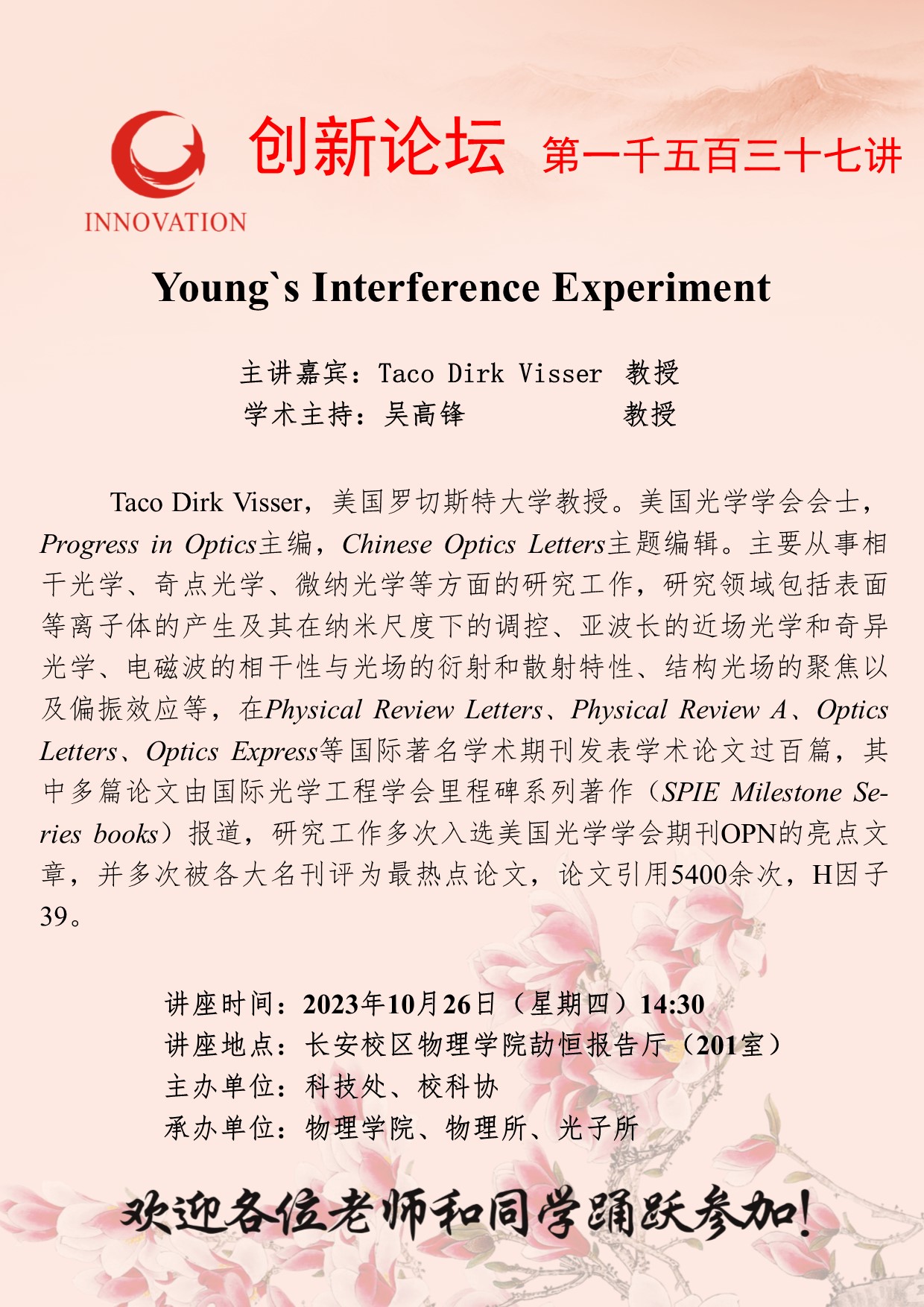 Taco Dirk Visser 教授 星空app官网创新论坛第一千五百三十七讲:Young`s Interference Experiment 讲座时间 2023年10月26日(星期四)14:30 讲座地点 长安校区物理学院劼恒报告厅(201室) 讲座人介绍 Taco Dirk Visser 教授 讲座内容
