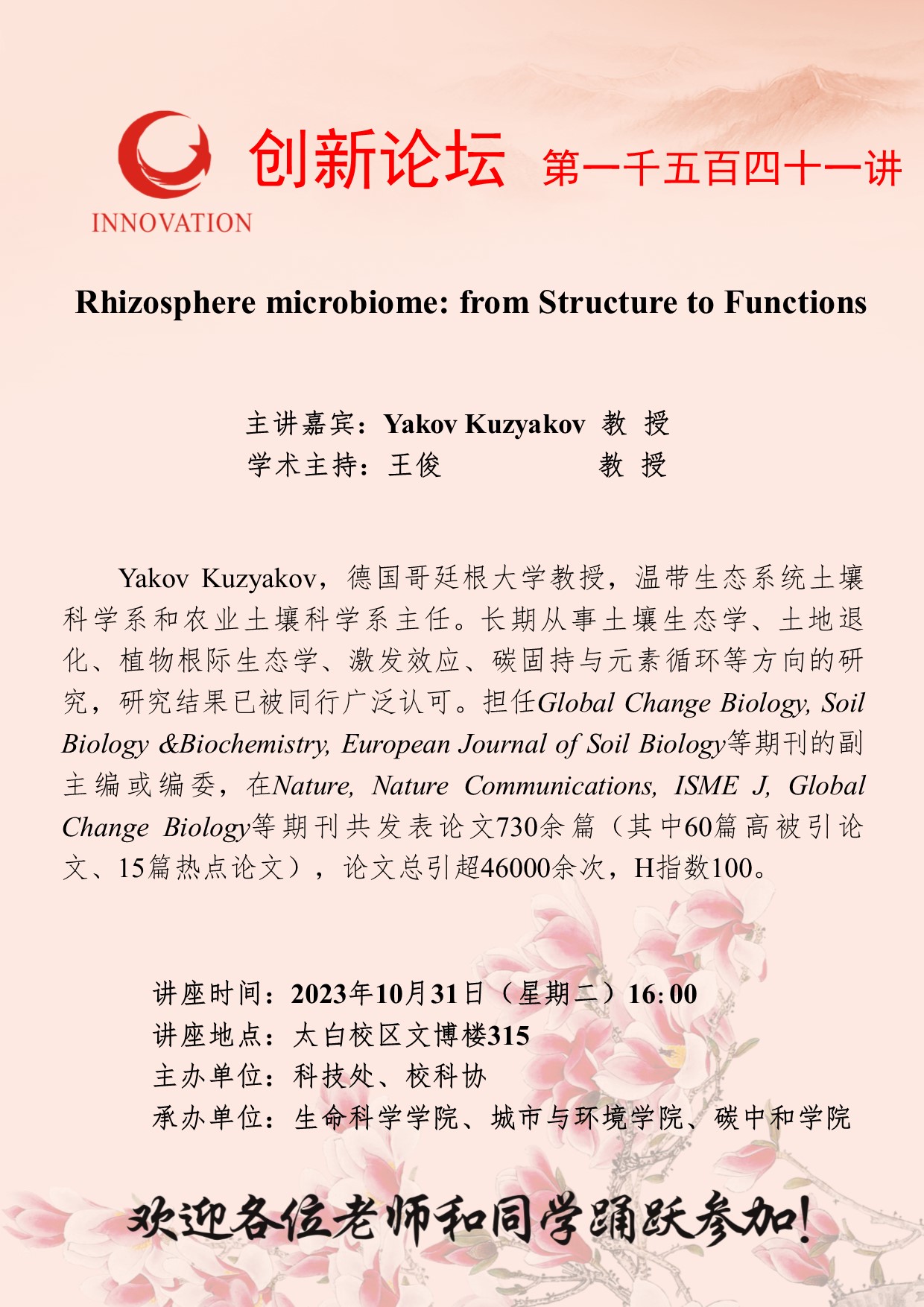 Yakov Kuzyakov 教 授 星空app官网创新论坛第一千五百四十一讲:Rhizosphere microbiome: from Structure to Functions 讲座时间 2023年10月31日(星期二)16:00 讲座地点 太白校区文博楼315 讲座人介绍 Yakov Kuzyakov 教 授 讲座内容