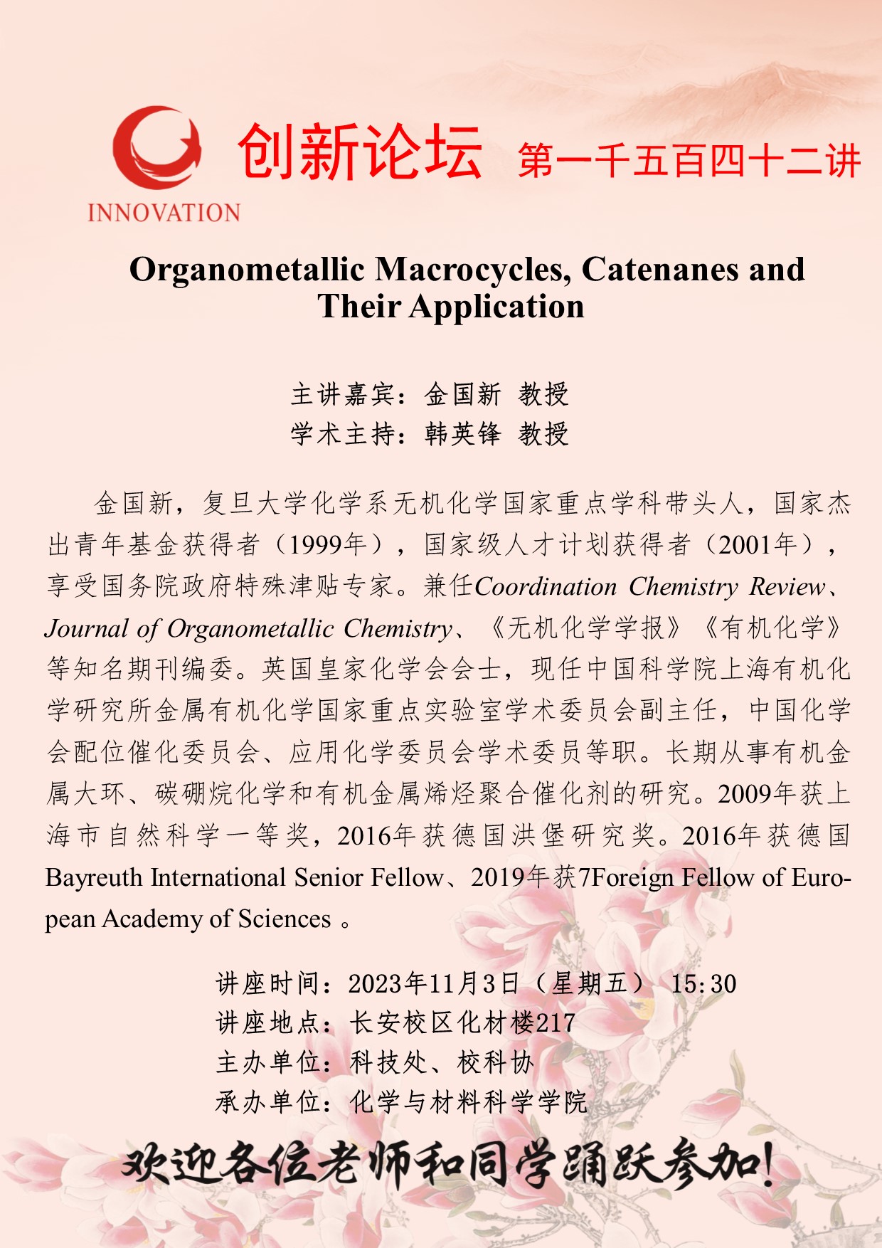 金国新 教授 星空app官网创新论坛第一千五百四十二讲:Organometallic Macrocycles, Catenanes and Their Application 讲座时间 2023年11月3日(星期五) 15:30 讲座地点 长安校区化材楼217 讲座人介绍 金国新 教授 讲座内容