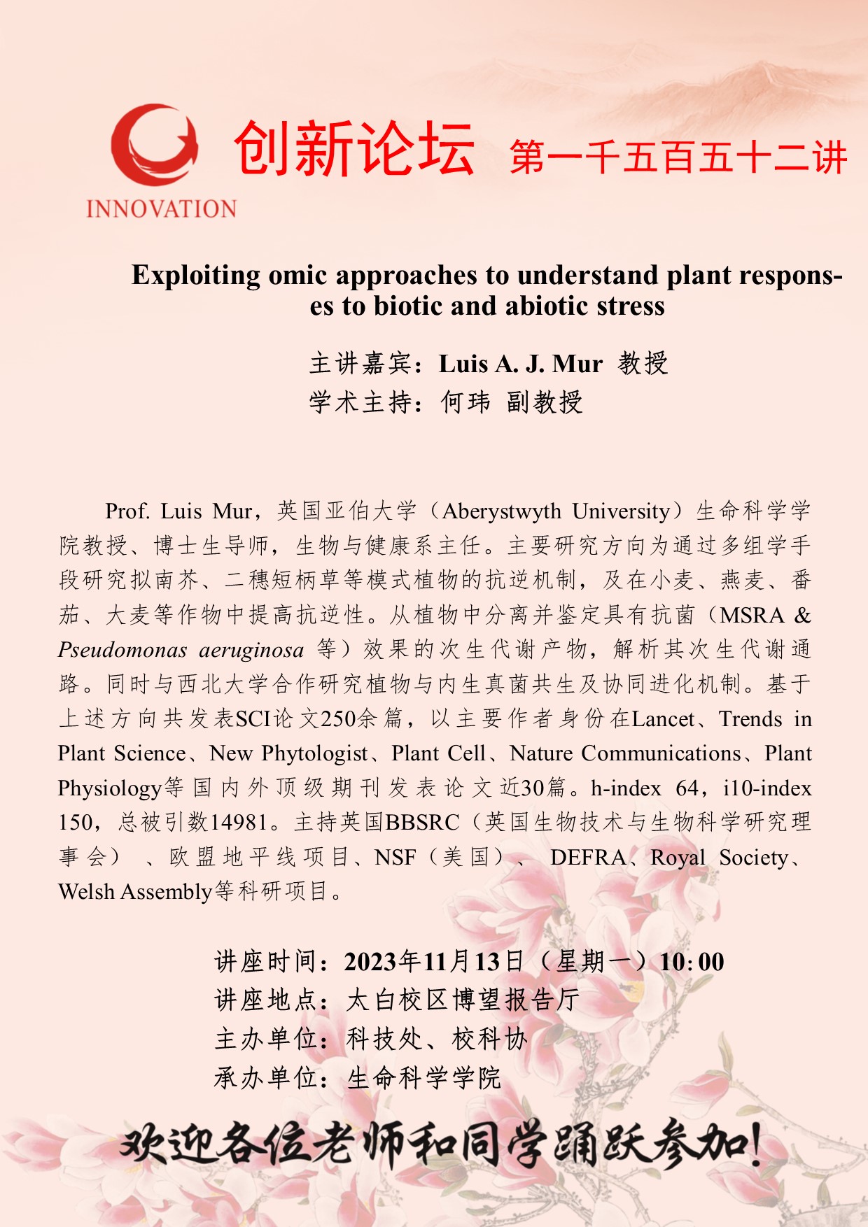 Luis A. J. Mur 教授 星空app官网创新论坛第一千五百五十二讲:Exploiting omic approaches to understand plant responses to biotic and abiotic stress 讲座时间 2023年11月13日(星期一)10:00 讲座地点 太白校区博望报告厅 讲座人介绍 Luis A. J. Mur 教授 讲座内容