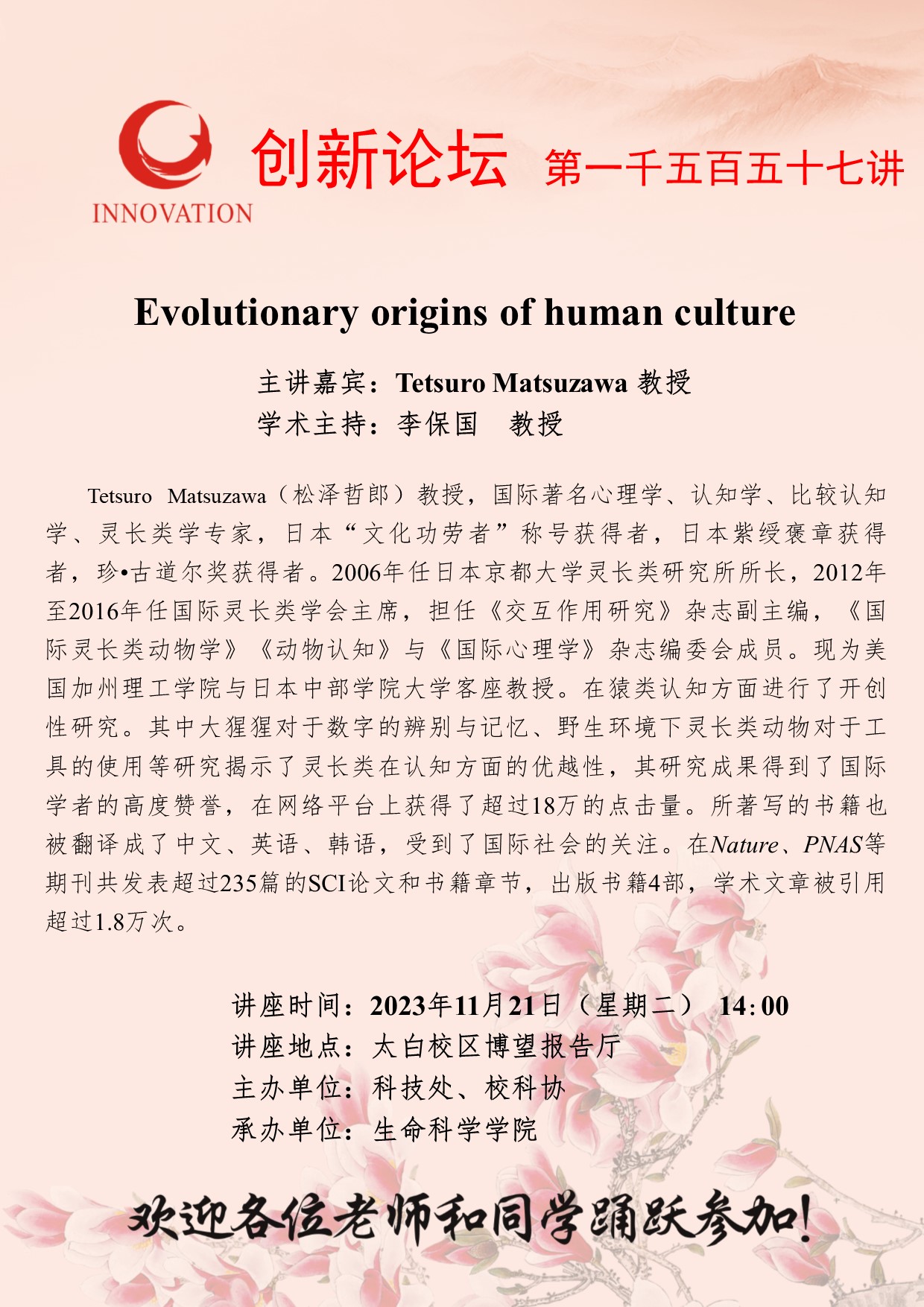 Tetsuro Matsuzawa 教授 星空app官网创新论坛第一千五百五十七讲:Evolutionary origins of human culture 讲座时间 2023年11月21日(星期二) 14:00 讲座地点 太白校区博望报告厅 讲座人介绍 Tetsuro Matsuzawa 教授 讲座内容