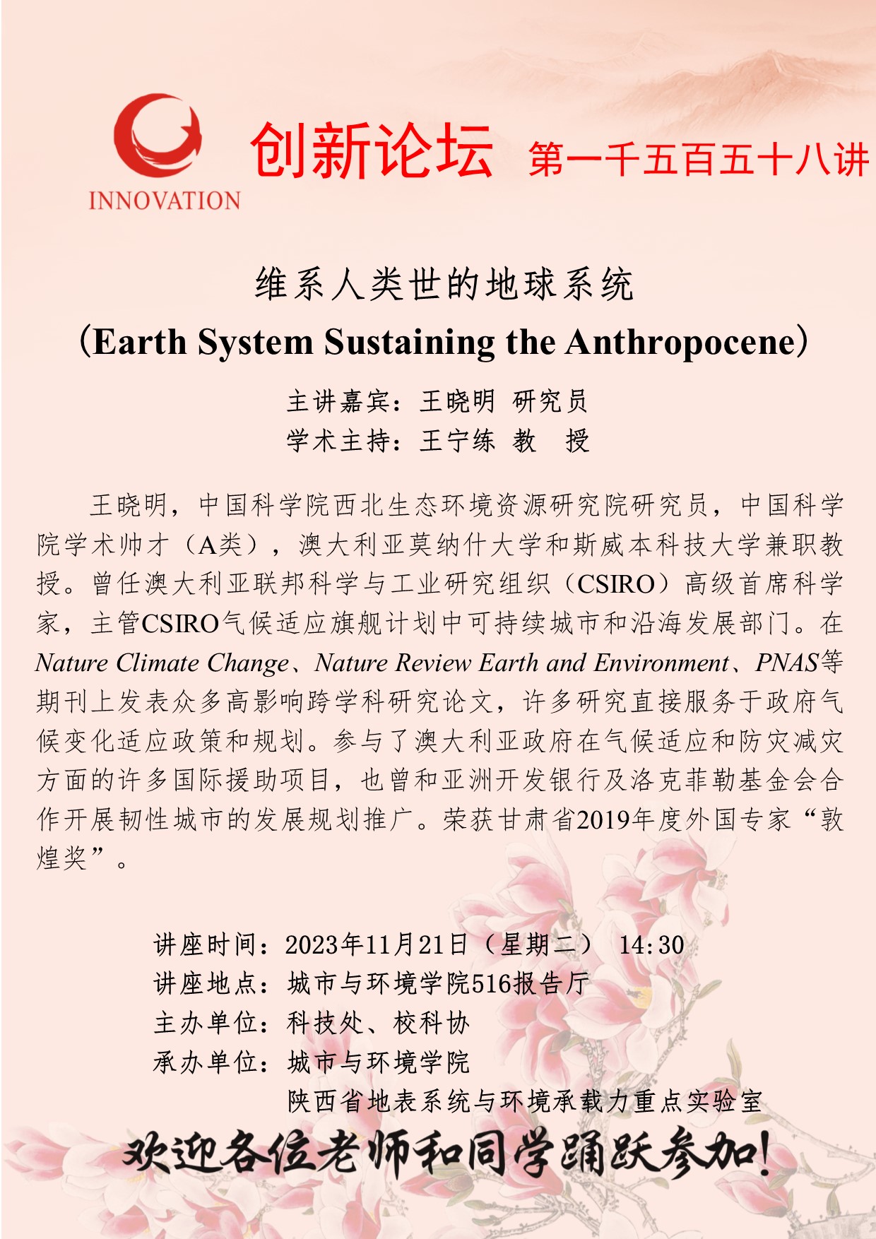 王晓明 研究员 星空app官网创新论坛第一千五百五十八讲:维系人类世的地球系统 讲座时间 2023年11月21日(星期二) 14:30 讲座地点 城市与环境学院516报告厅 讲座人介绍 王晓明 研究员 讲座内容