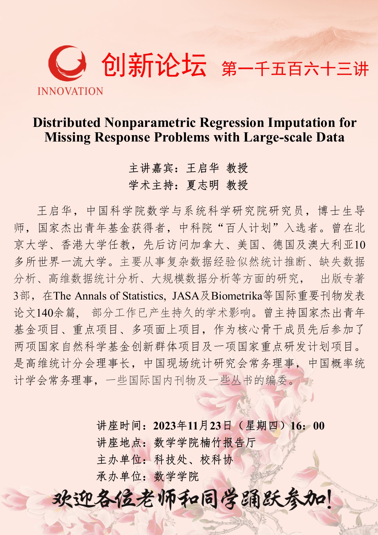 王启华 教授 星空app官网创新论坛第一千五百六十三讲:Distributed Nonparametric Regression Imputation for Missing Response Problems with Large-scale Data 讲座时间 2023年11月23日(周四)16:00 讲座地点 数学学院楠竹报告厅 讲座人介绍 王启华 教授 讲座内容