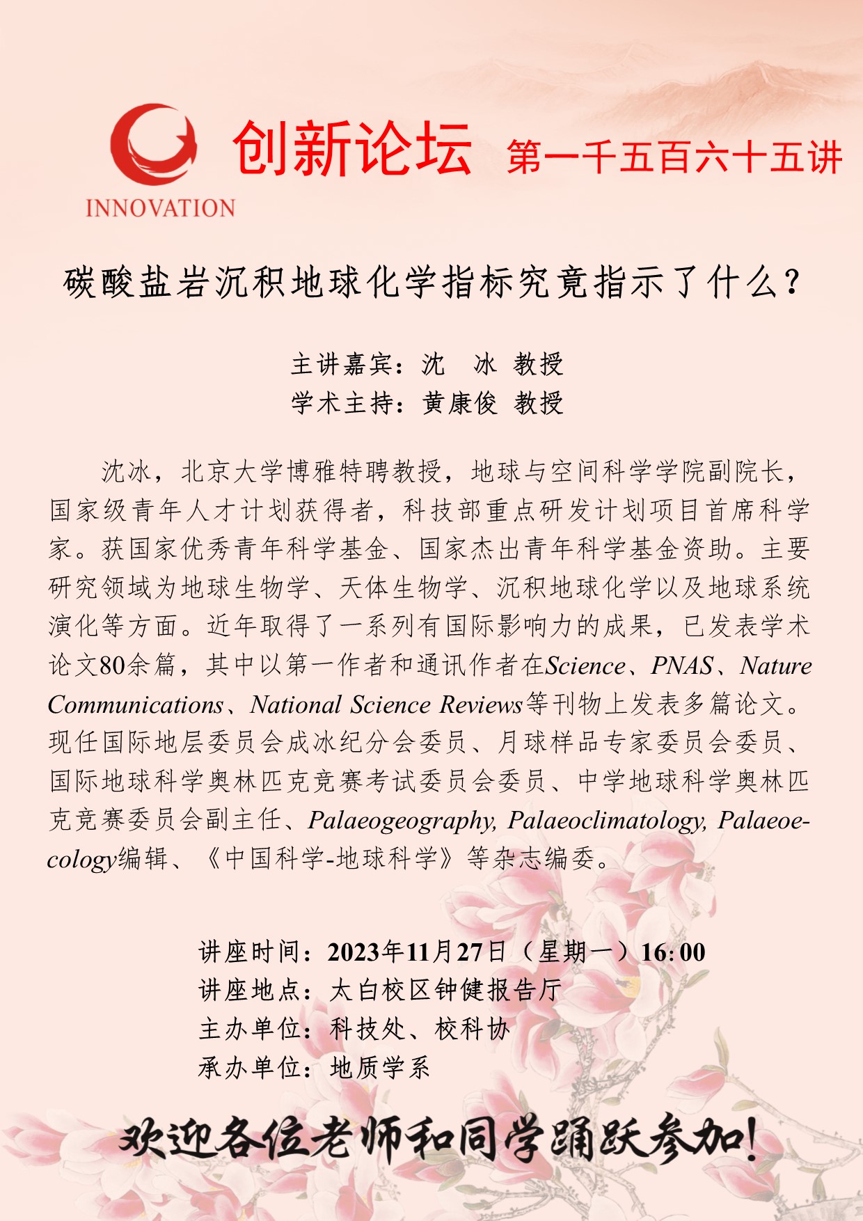 沈冰 教授 星空app官网创新论坛第一千五百六十五讲:碳酸盐岩沉积地球化学指标究竟指示了什么? 讲座时间 2023年11月27日(星期一)16:00 讲座地点 太白校区钟健报告厅 讲座人介绍 沈冰 教授 讲座内容