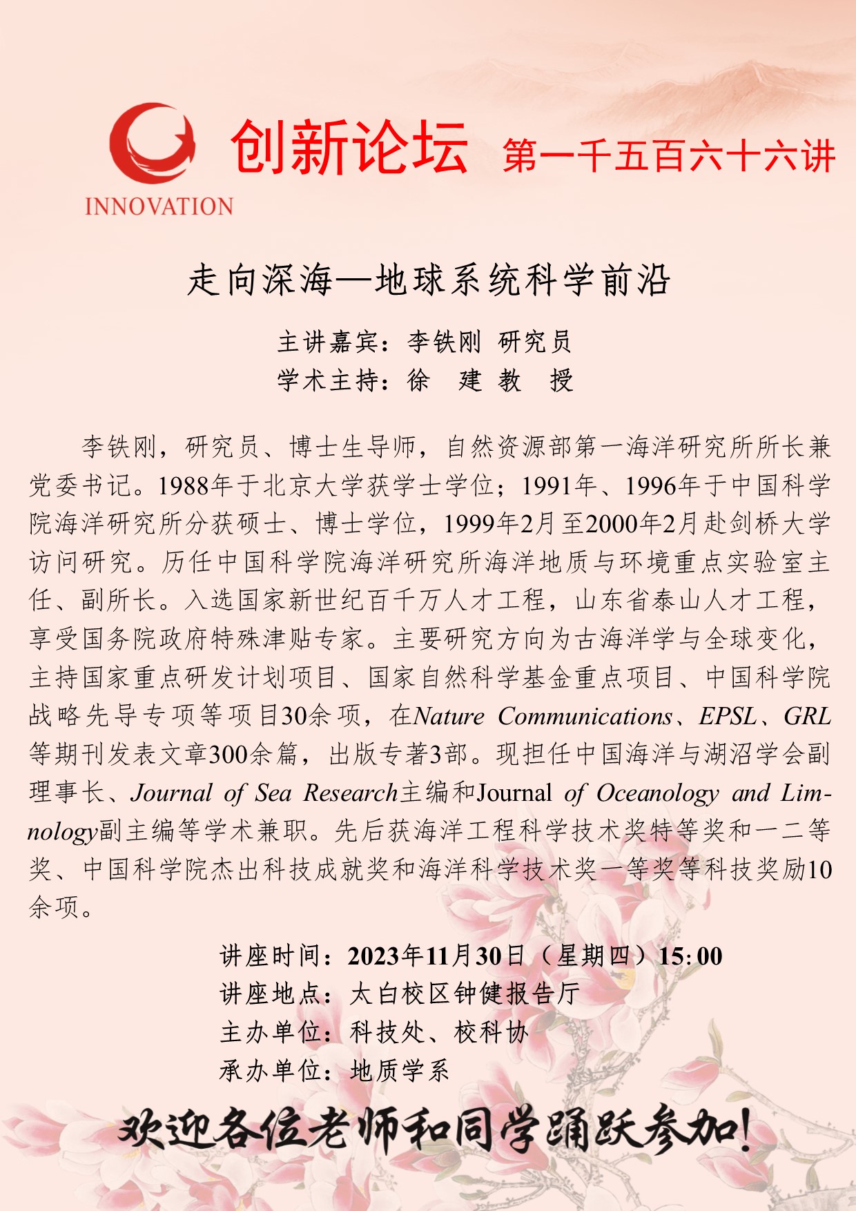 李铁刚 研究员 星空app官网创新论坛第一千五百六十六讲:走向深海—地球系统科学前沿 讲座时间 2023年11月30日(星期四)15:00 讲座地点 太白校区钟健报告厅 讲座人介绍 李铁刚 研究员 讲座内容