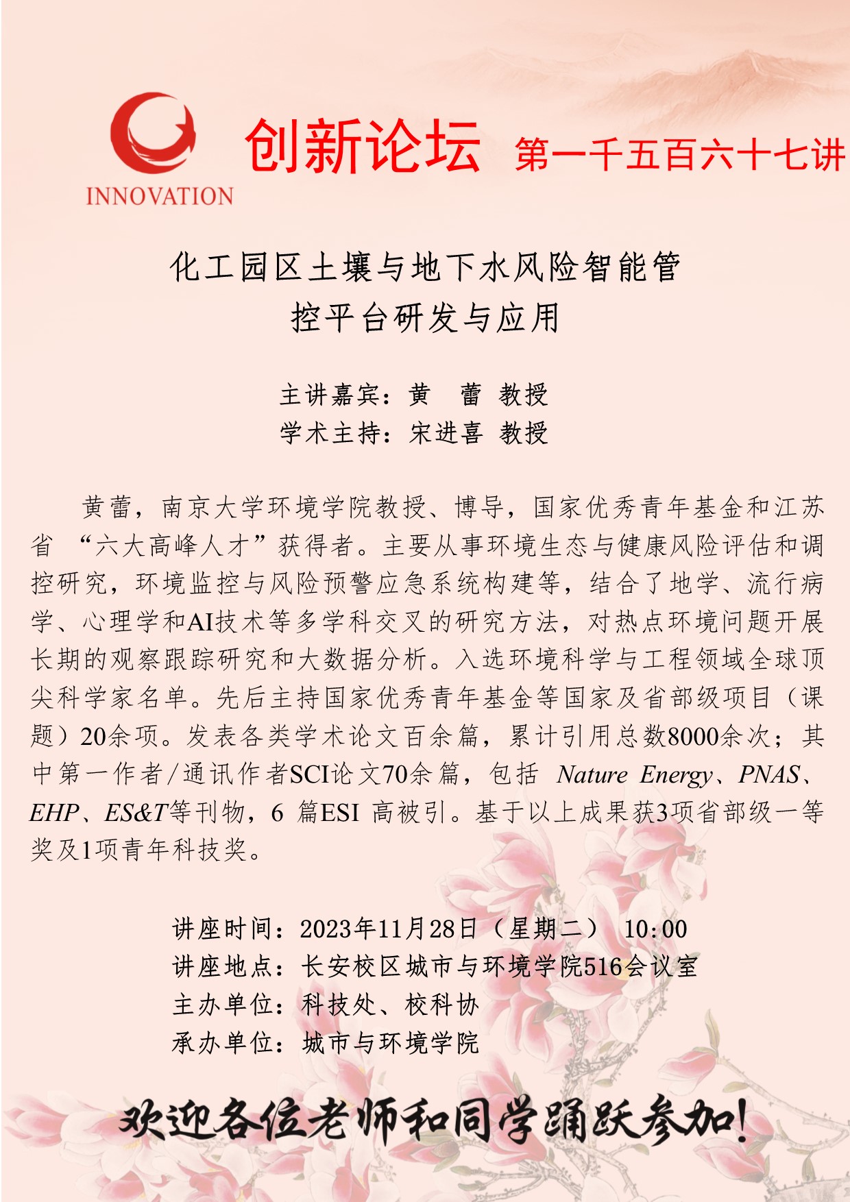 黄蕾 教授 星空app官网创新论坛第一千五百六十七讲:化工园区土壤与地下水风险智能管控平台研发与应用 讲座时间 2023年11月28日(星期二) 10:00 讲座地点 长安校区城市与环境学院516会议室 讲座人介绍 黄蕾 教授 讲座内容