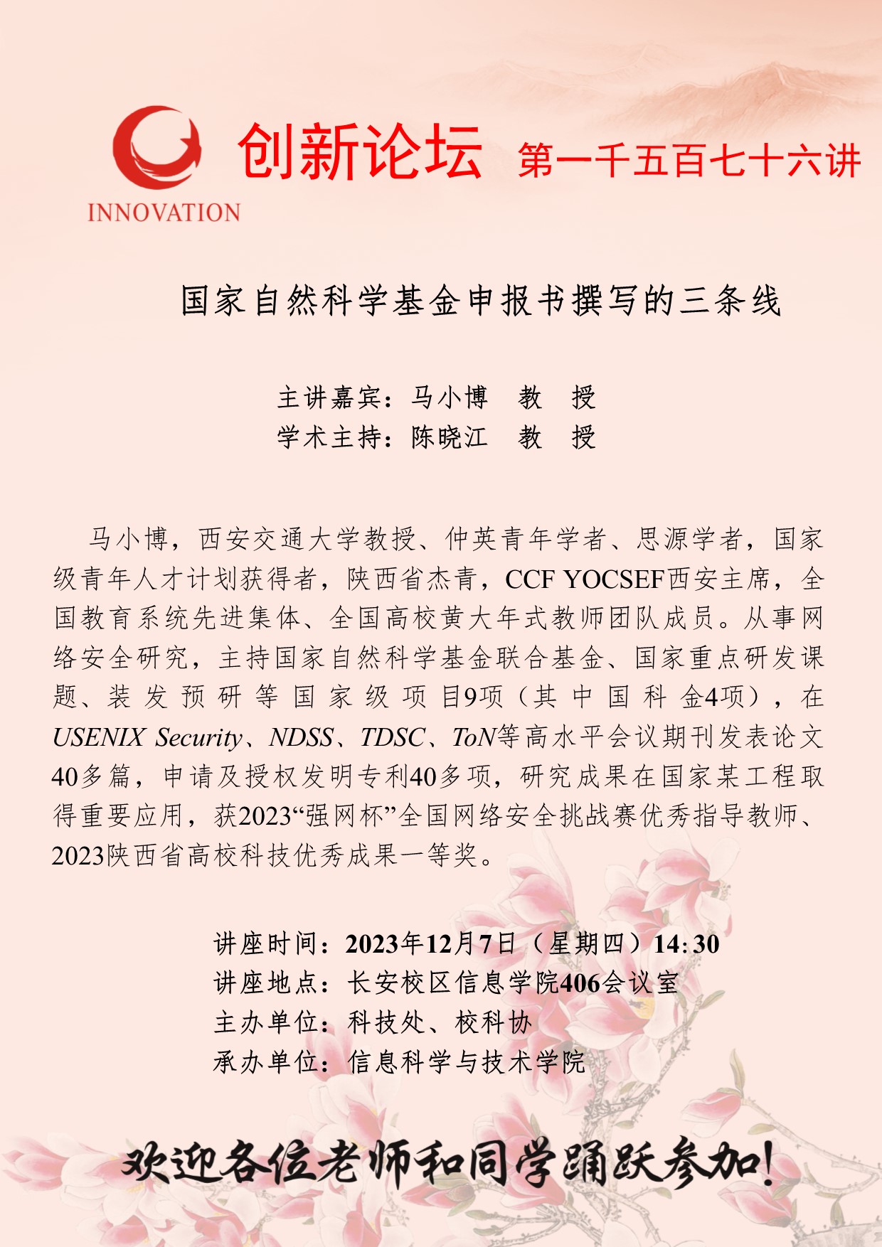 马小博 教授 星空app官网创新论坛第一千五百七十六讲:国家自然科学基金申报书撰写的三条线 讲座时间 2023年12月7日(星期四)14:30 讲座地点 长安校区信息学院406会议室 讲座人介绍 马小博 教授 讲座内容