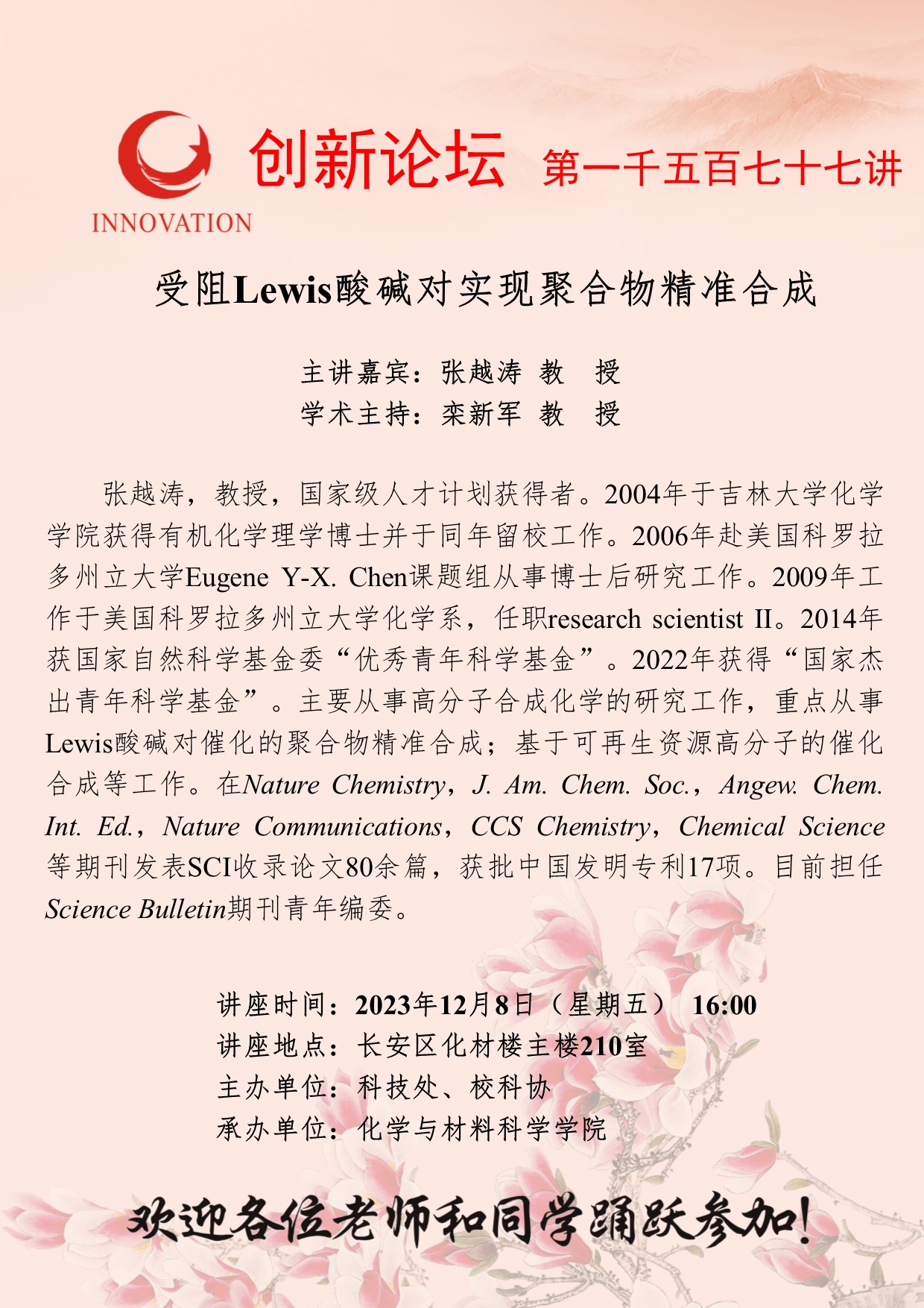 张越涛 教授 星空app官网创新论坛第一千五百七十七讲:受阻Lewis酸碱对实现聚合物精准合成 讲座时间 2023年12月8日(星期五) 16:00 讲座地点 长安区化材楼主楼210室 讲座人介绍 张越涛 教授 讲座内容
