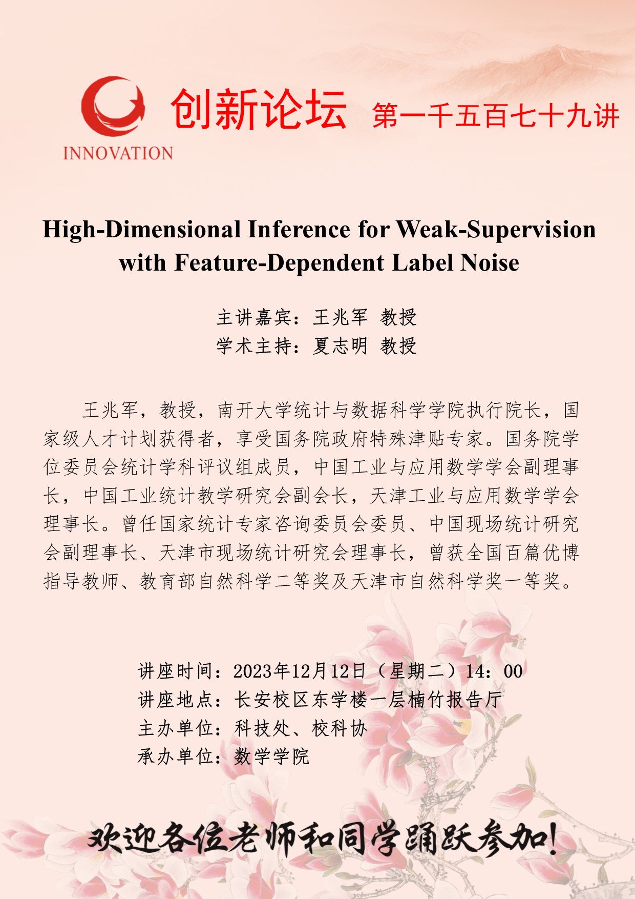 王兆军 教授 星空app官网创新论坛第一千五百七十九讲:High-Dimensional Inference for Weak-Supervision with Feature-Dependent Label Noise 讲座时间 2023年12月12日(星期二)14:00 讲座地点 长安校区东学楼一层楠竹报告厅 讲座人介绍 王兆军 教授 讲座内容