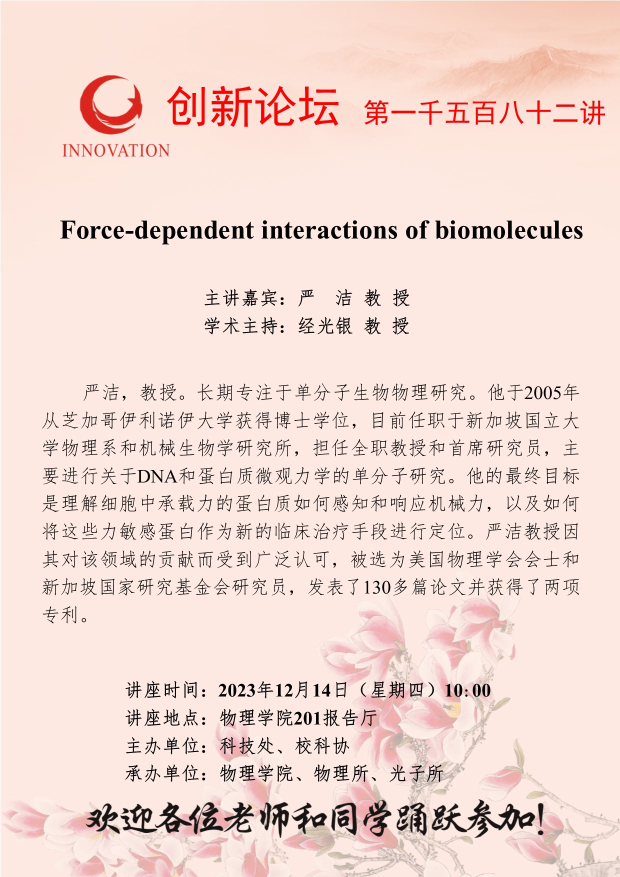 严洁 教授 星空app官网创新论坛第一千五百八十二讲:Force-dependent interactions of biomolecules 讲座时间 2023年12月14日(星期四)10:00 讲座地点 物理学院201报告厅 讲座人介绍 严洁 教授 讲座内容
