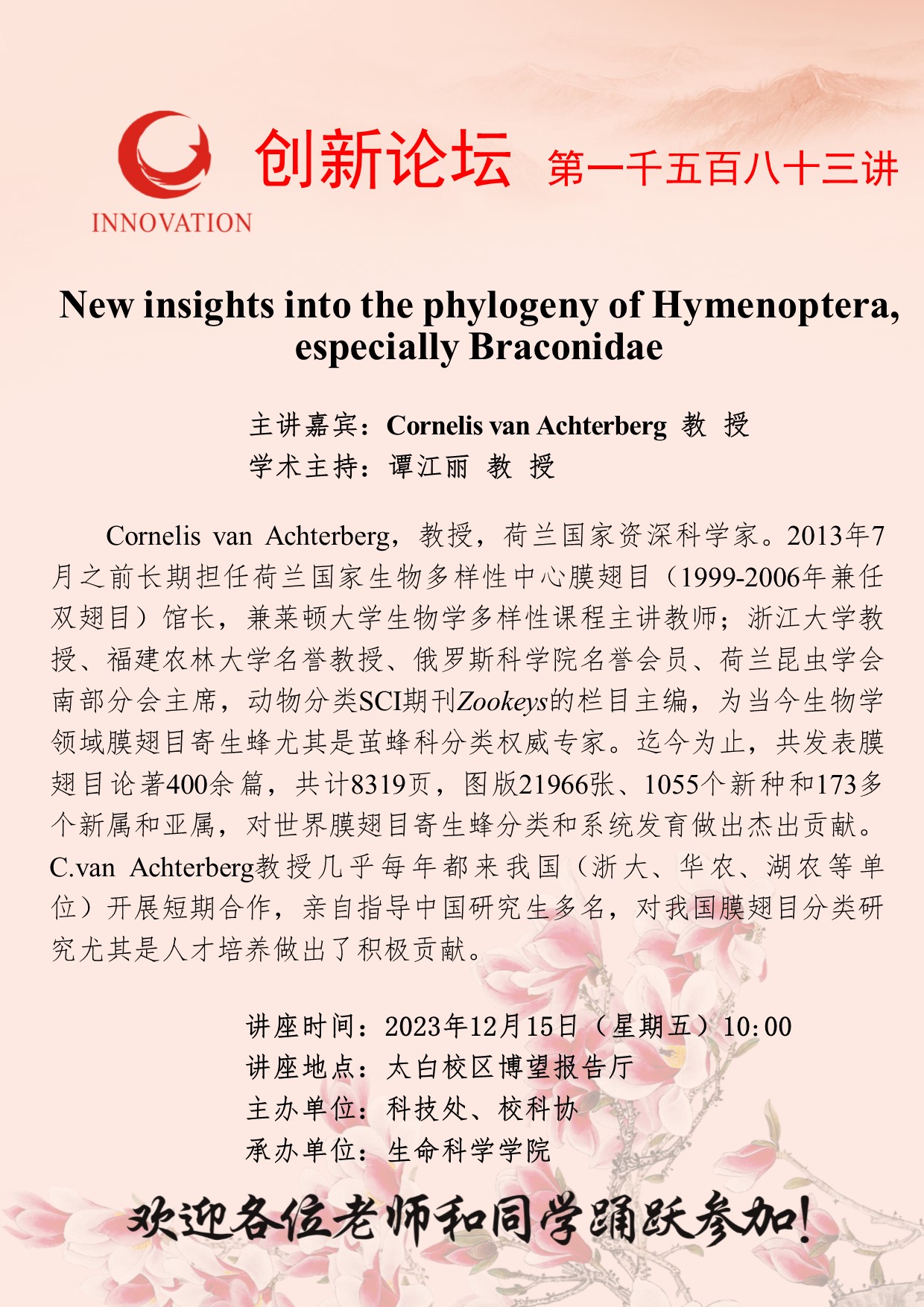 Cornelis van Achterberg 教 授 星空app官网创新论坛第一千五百八十三讲:New insights into the phylogeny of Hymenoptera, especially Braconidae 讲座时间 2023年12月15日(星期五)10:00 讲座地点 太白校区博望报告厅 讲座人介绍 Cornelis van Achterberg 教 授 讲座内容