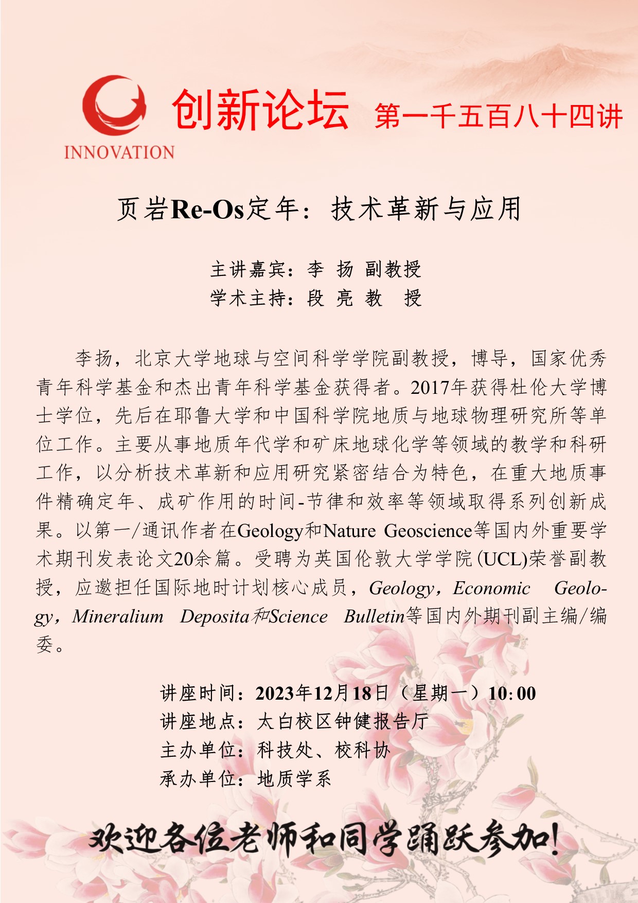 李扬 副教授 星空app官网创新论坛第一千五百八十四讲:页岩Re-Os定年: 技术革新与应用 讲座时间 2023年12月18日(星期一)10:00 讲座地点 太白校区钟健报告厅 讲座人介绍 李扬 副教授 讲座内容