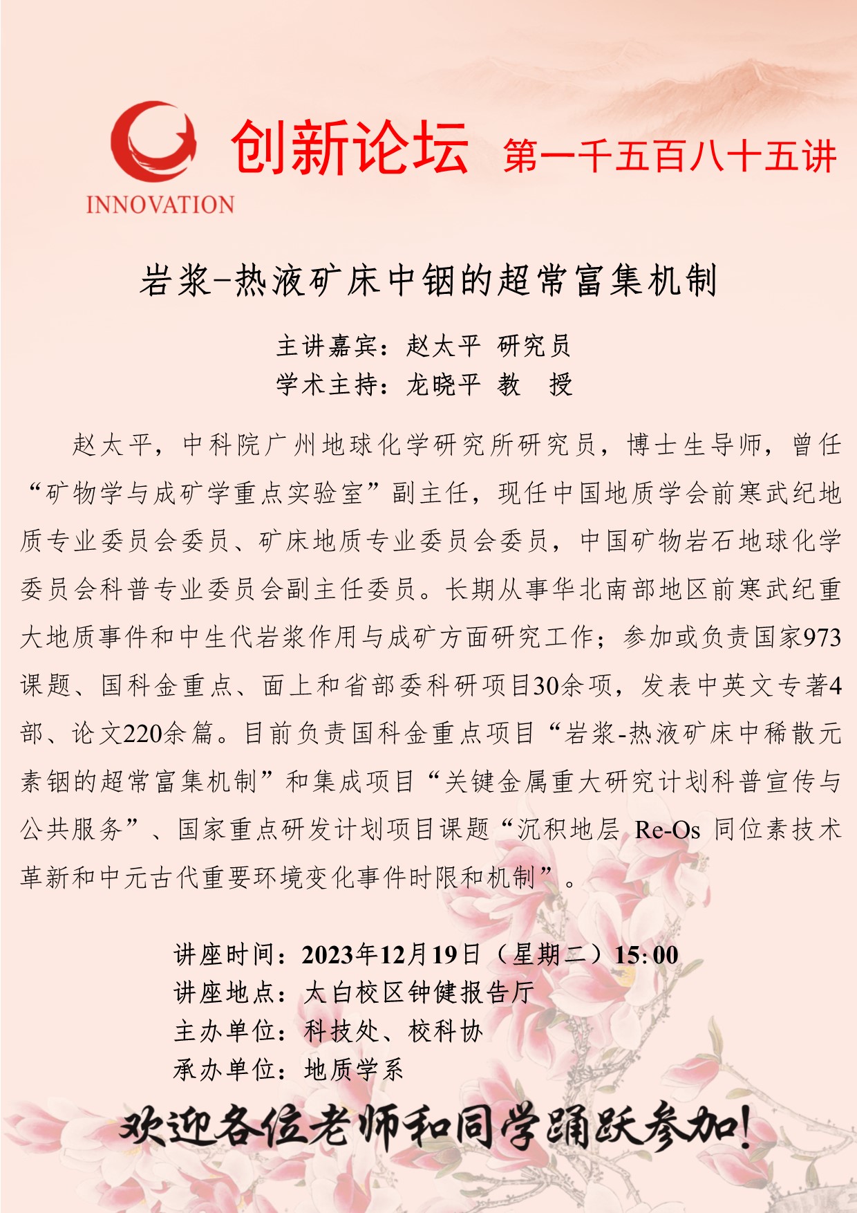 赵太平 研究员 星空app官网创新论坛第一千五百八十五讲:岩浆-热液矿床中铟的超常富集机制 讲座时间 2023年12月19日(星期二)15:00 讲座地点 太白校区钟健报告厅 讲座人介绍 赵太平 研究员 讲座内容