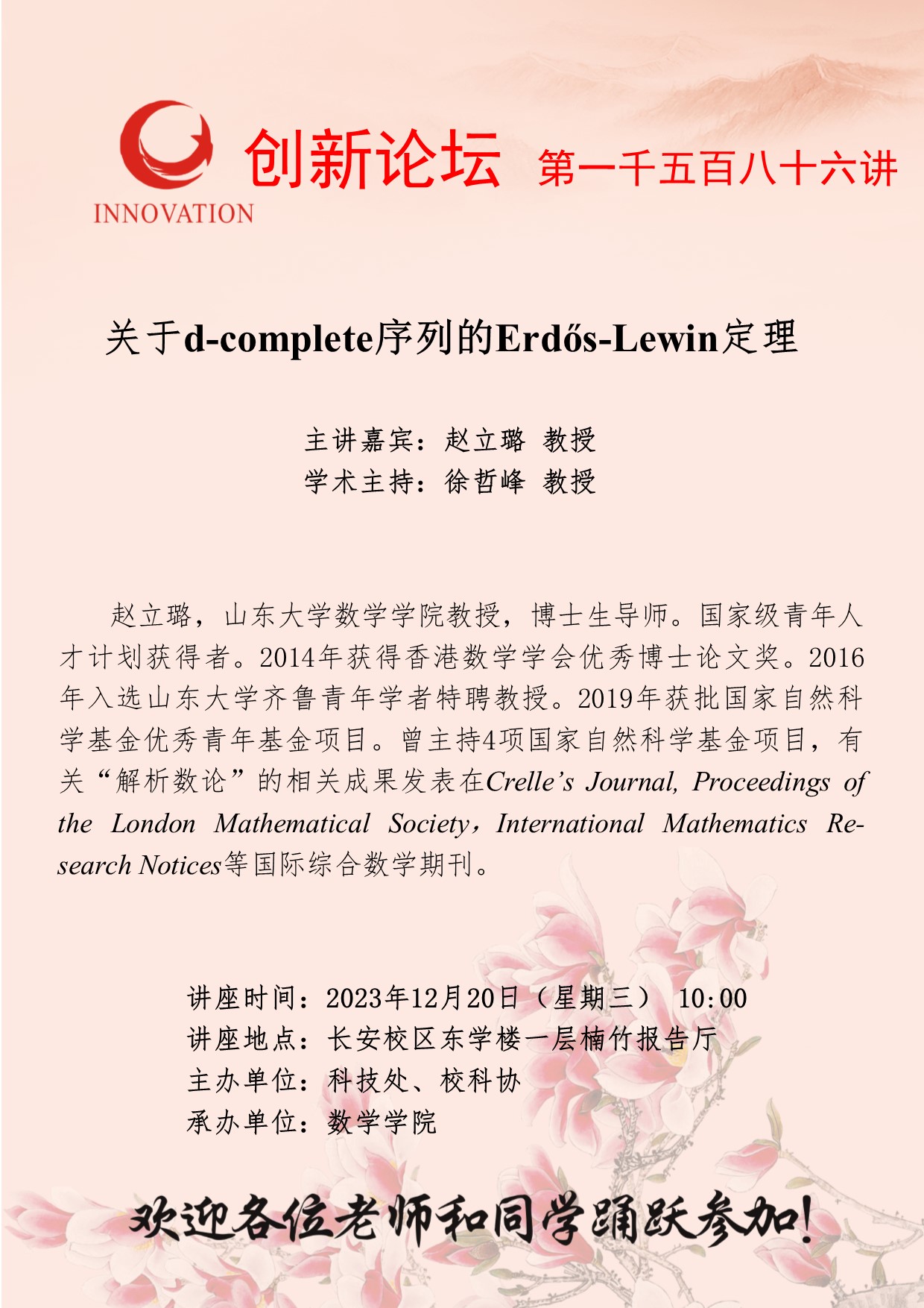 赵立璐 教授 星空app官网创新论坛第一千五百八十六讲:关于d-complete序列的Erdős-Lewin定理 讲座时间 2023年12月20日(星期三) 10:00 讲座地点 长安校区东学楼一层楠竹报告厅 讲座人介绍 赵立璐 教授 讲座内容