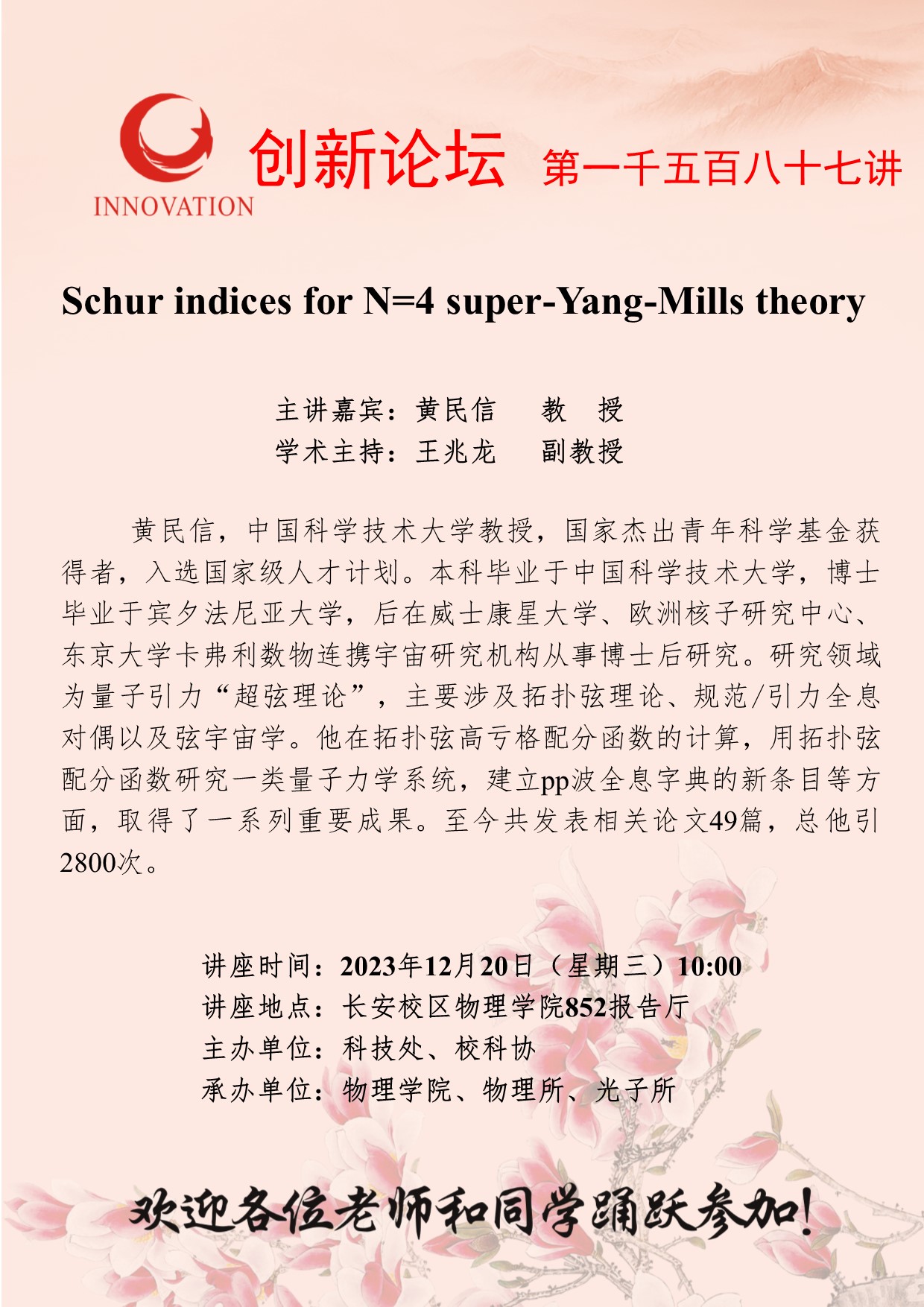 黄民信 教 授 星空app官网创新论坛第一千五百八十七讲:Schur indices for N=4 super-Yang-Mills theory 讲座时间 2023年12月20日(星期三)10:00 讲座地点 长安校区物理学院852报告厅 讲座人介绍 黄民信 教 授 讲座内容