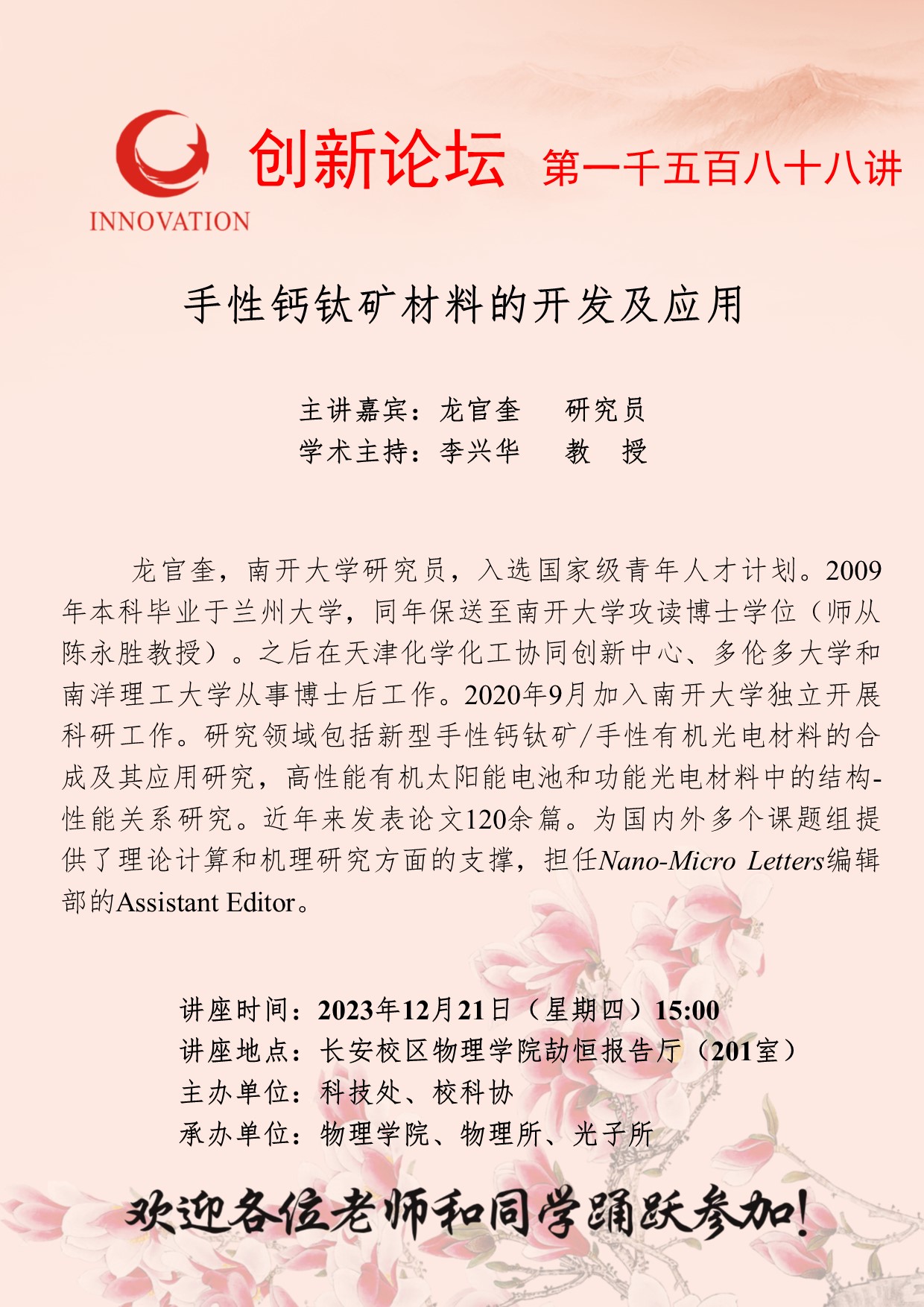 龙官奎 研究员 星空app官网创新论坛第一千五百八十八讲:手性钙钛矿材料的开发及应用 讲座时间 2023年12月21日(星期四)15:00 讲座地点 长安校区物理学院劼恒报告厅(201室) 讲座人介绍 龙官奎 研究员 讲座内容