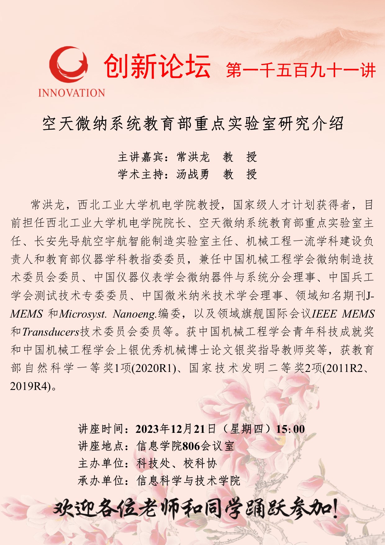 常洪龙 教授 星空app官网创新论坛第一千五百九十一讲:空天微纳系统教育部重点实验室研究介绍 讲座时间 2023年12月21日(星期四)15:00 讲座地点 信息学院806会议室 讲座人介绍 常洪龙 教授 讲座内容