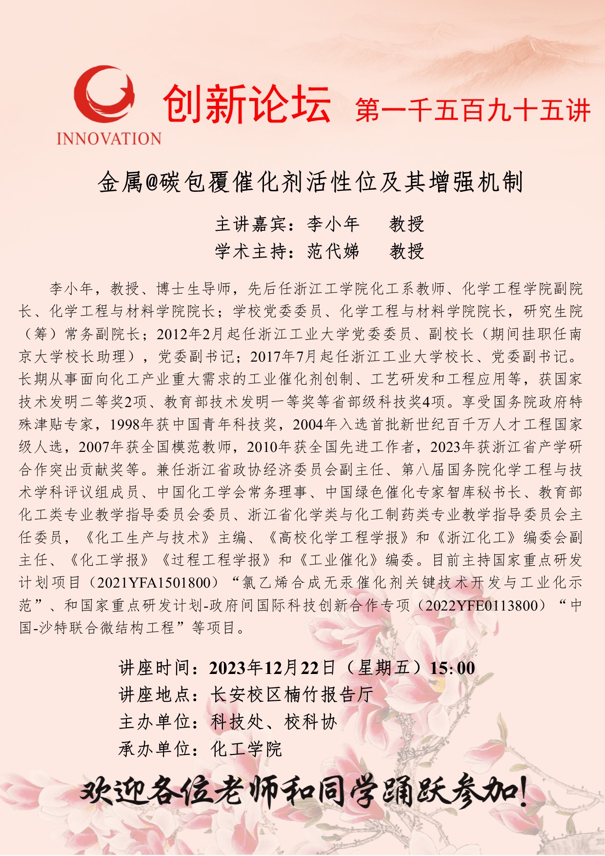 李小年 教授 星空app官网创新论坛第一千五百九十五讲:金属@碳包覆催化剂活性位及其增强机制 讲座时间 2023年12月22日(星期五)15:00 讲座地点 长安校区楠竹报告厅 讲座人介绍 李小年 教授 讲座内容
