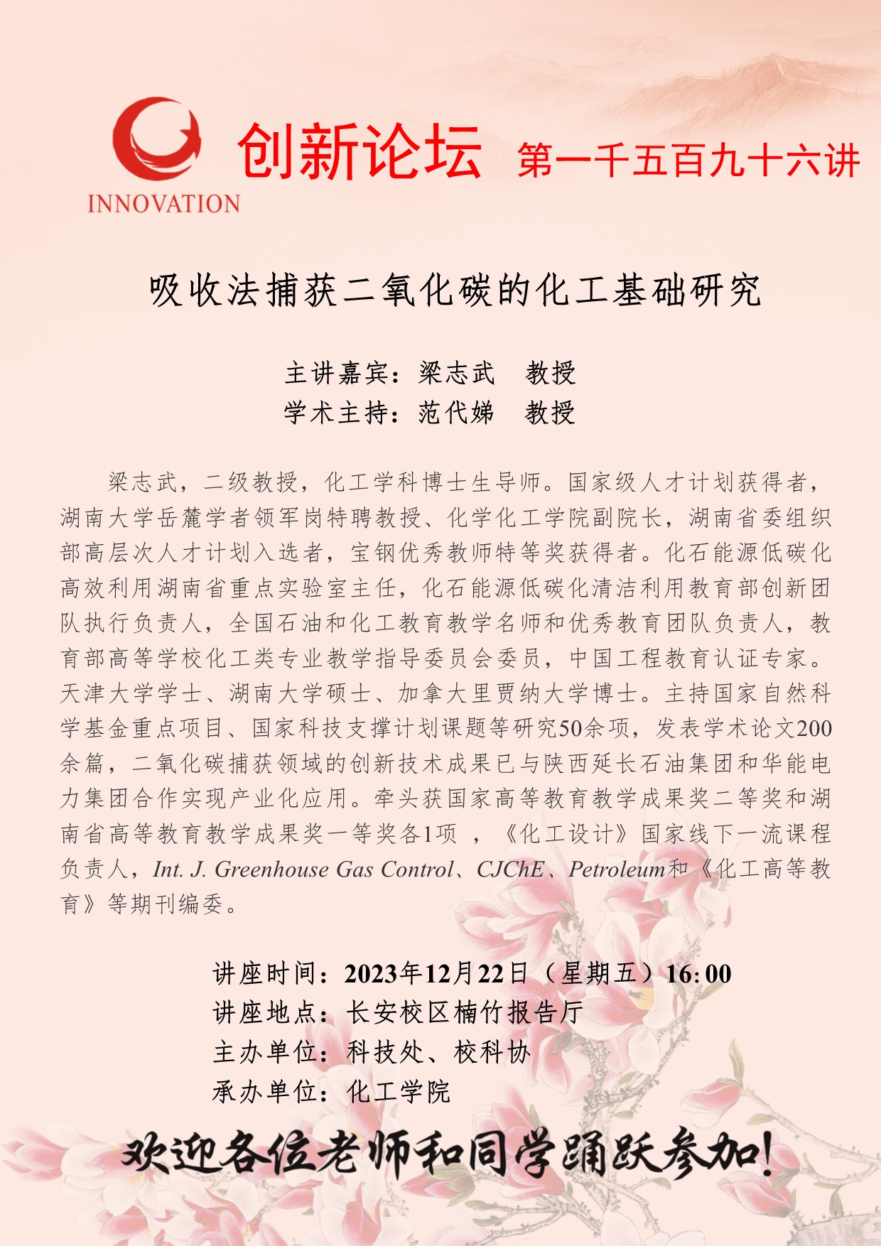 梁志武 教授 星空app官网创新论坛第一千五百九十六讲:吸收法捕获二氧化碳的化工基础研究 讲座时间 2023年12月22日(星期五)16:00 讲座地点 长安校区楠竹报告厅 讲座人介绍 梁志武 教授 讲座内容