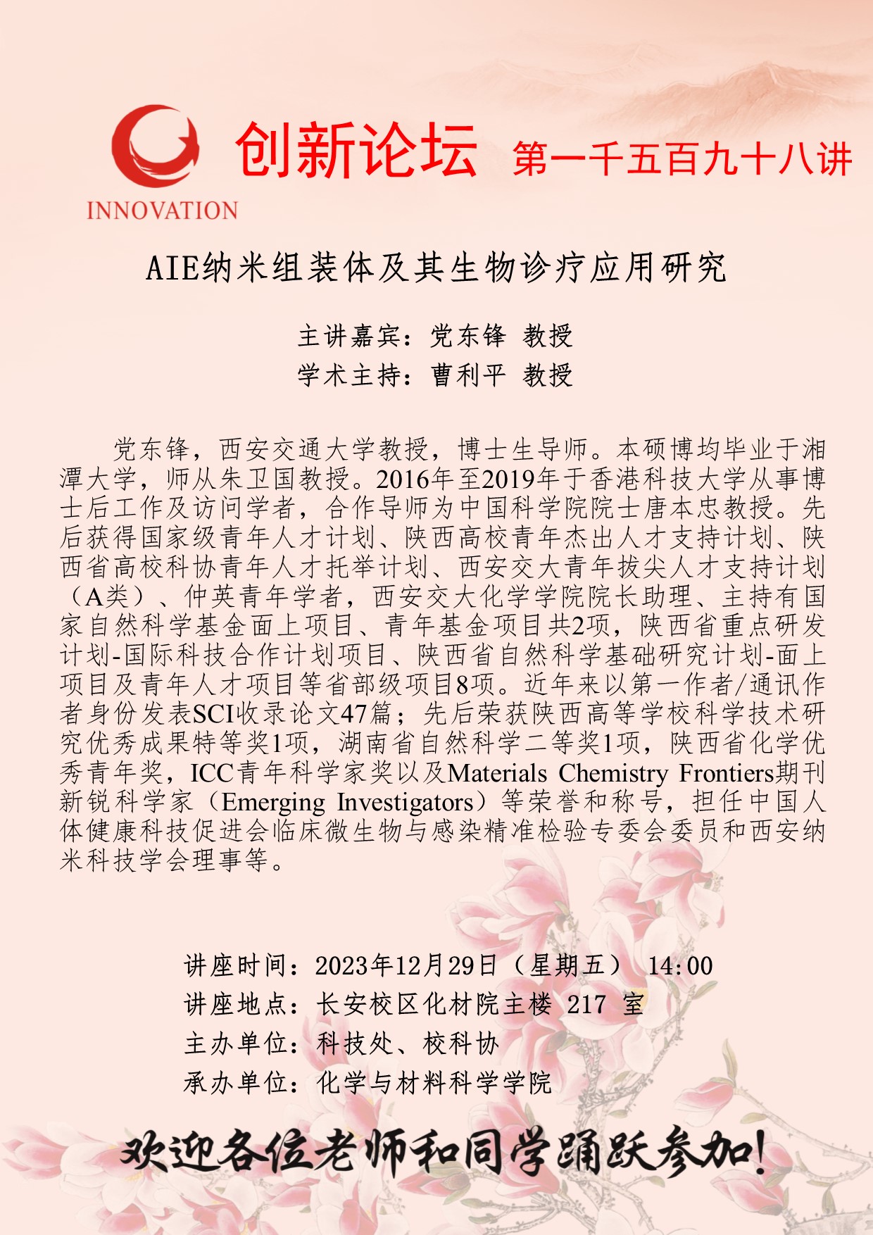 党东锋 教授 星空app官网创新论坛第一千五百九十八讲:AIE纳米组装体及其生物诊疗应用研究 讲座时间 2023年12月29日(星期五) 14:00 讲座地点 长安校区化材院主楼217室 讲座人介绍 党东锋 教授 讲座内容