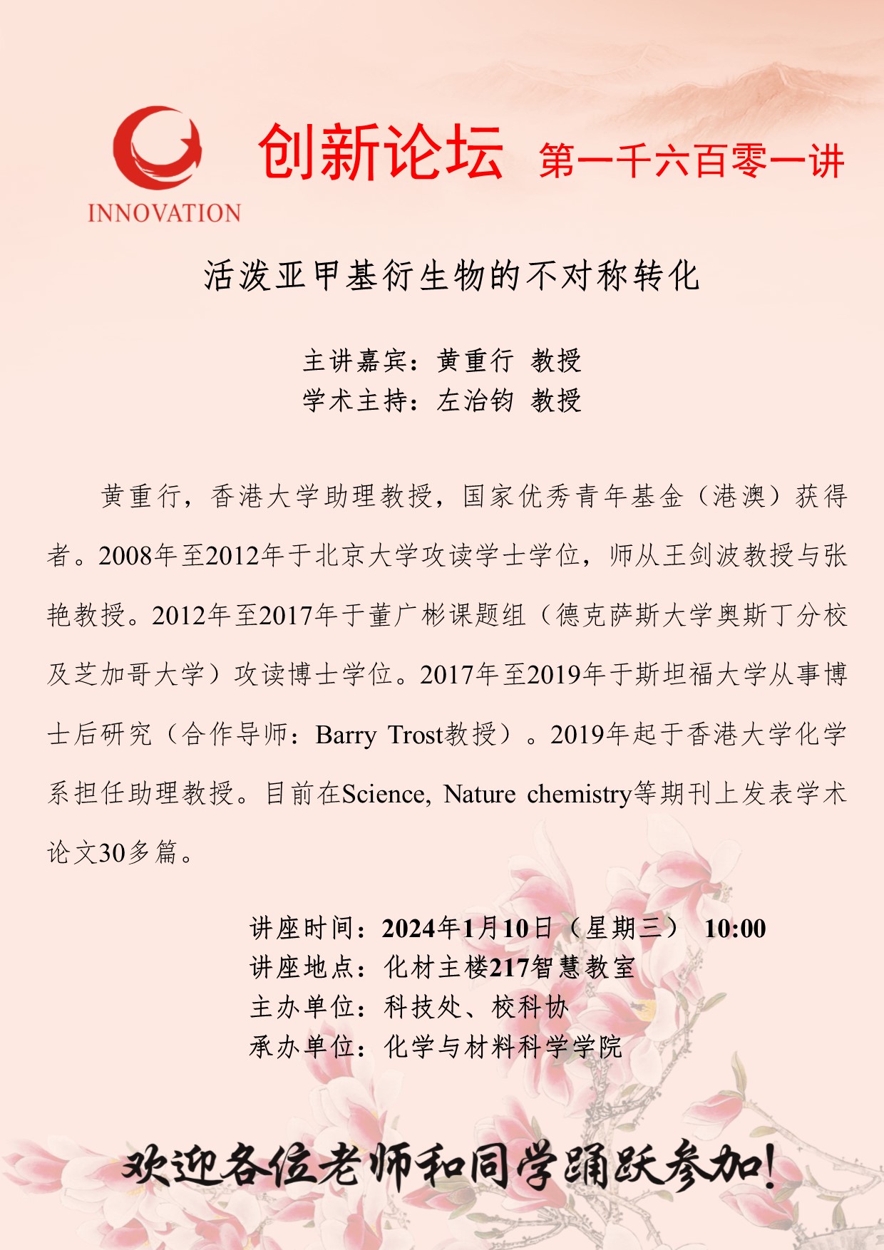 黄重行 教授 星空app官网创新论坛第一千六百零一讲:活泼亚甲基衍生物的不对称转化 讲座时间 2024年1月10日(星期三) 10:00 讲座地点 化材主楼217智慧教室 讲座人介绍 黄重行 教授 讲座内容