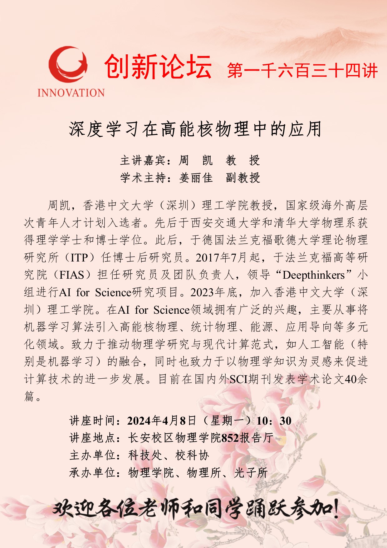 周凯 教授 星空app官网创新论坛第一千六百三十四讲:深度学习在高能核物理中的应用 讲座时间 2024年4月8日(星期一)10:30 讲座地点 长安校区物理学院852报告厅 讲座人介绍 周凯 教授 讲座内容