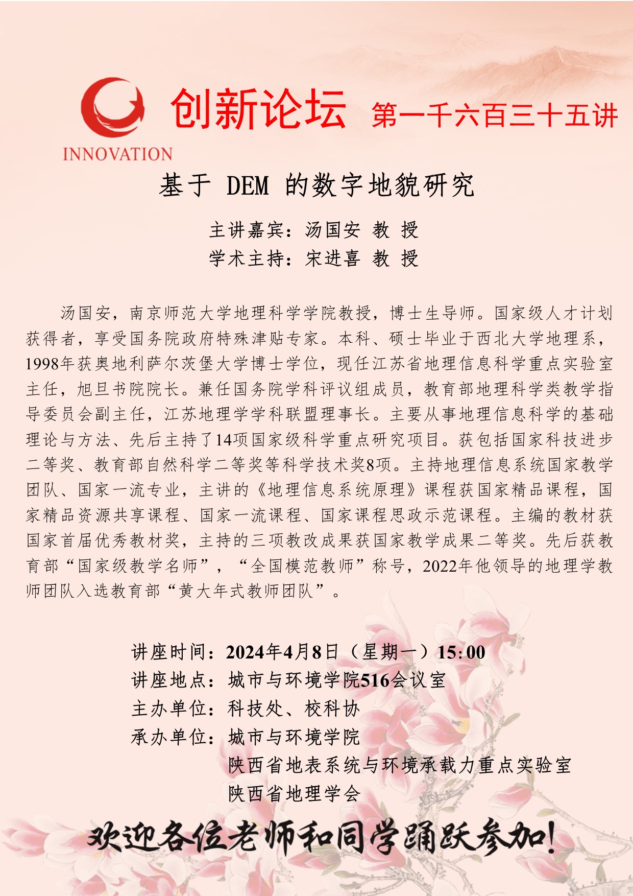 汤国安 教授 星空app官网创新论坛第一千六百三十五讲:基于 DEM 的数字地貌研究 讲座时间 2024年4月8日(星期一)15:00 讲座地点 城市与环境学院516会议室 讲座人介绍 汤国安 教授 讲座内容