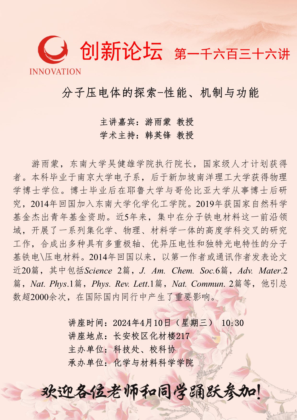 游雨蒙 教授 星空app官网创新论坛第一千六百三十六讲:分子压电体的探索-性能、机制与功能 讲座时间 2024年4月10日(星期三) 10:30 讲座地点 长安校区化材楼217 讲座人介绍 游雨蒙 教授 讲座内容