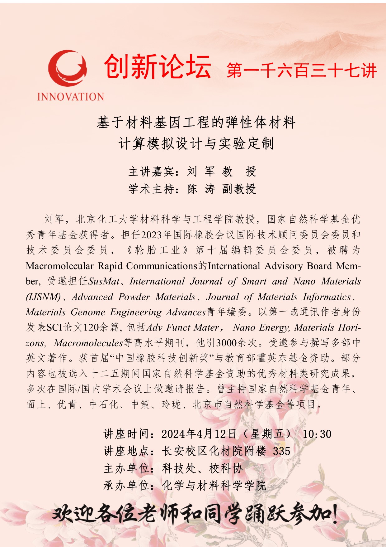 刘军 教授 星空app官网创新论坛第一千六百三十七讲:基于材料基因工程的弹性体材料计算模拟设计与实验定制 讲座时间 2024年4月12日(星期五) 10:30 讲座地点 长安校区化材院附楼335 讲座人介绍 刘军 教授 讲座内容