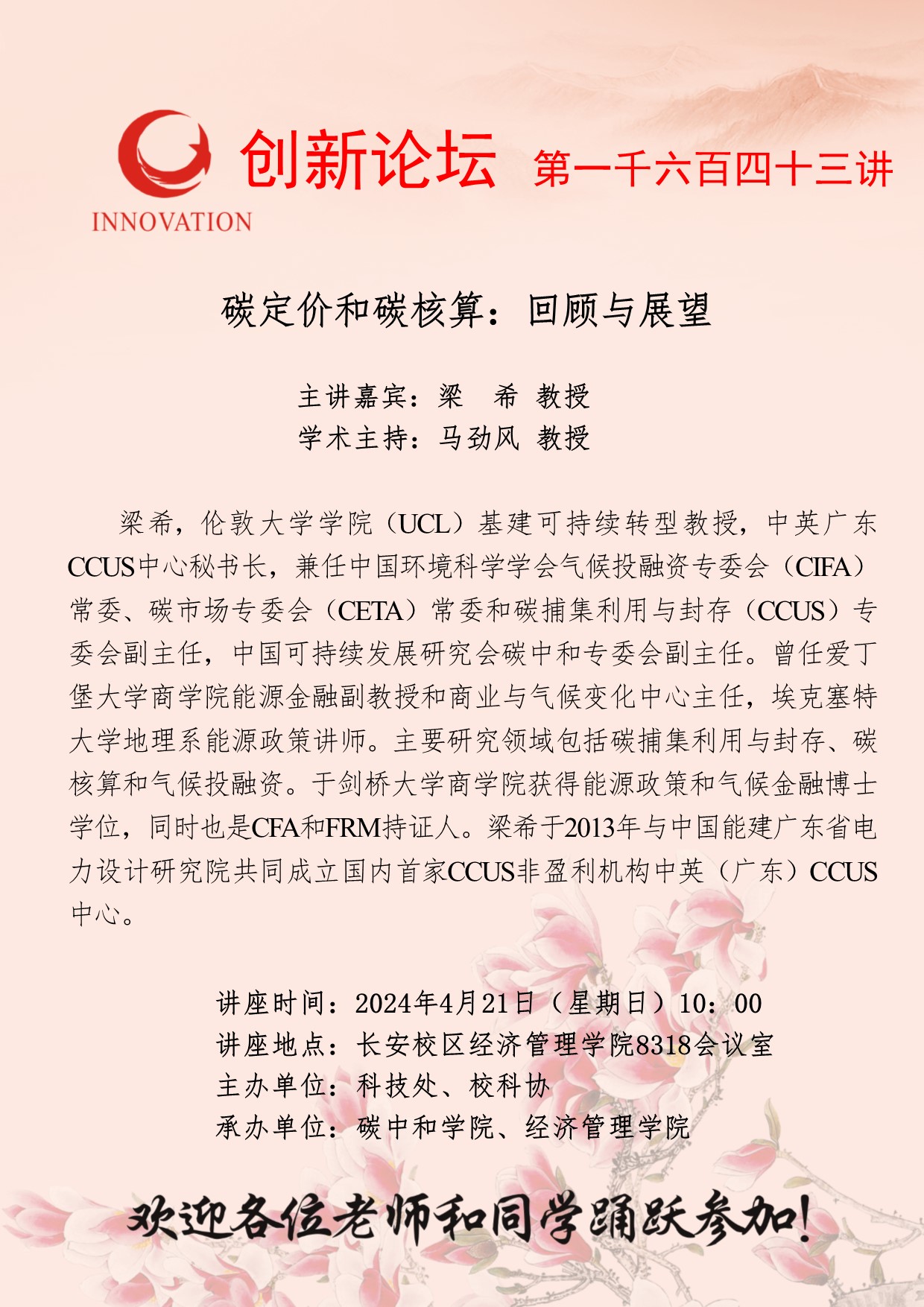 梁希 教授 星空app官网创新论坛第一千六百四十三讲:碳定价和碳核算:回顾与展望 讲座时间 2024年4月21日(星期日)10:00 讲座地点 长安校区经济管理学院8318会议室 讲座人介绍 梁希 教授 讲座内容