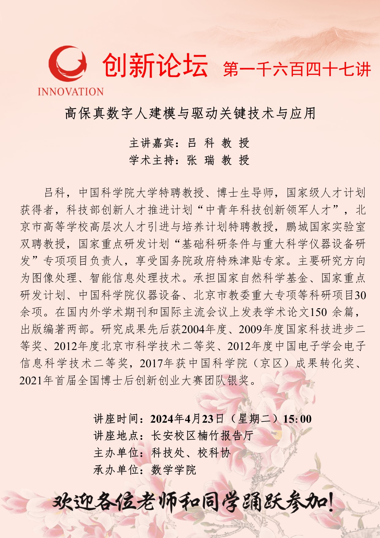 吕科 教授 星空app官网创新论坛第一千六百四十七讲:高保真数字人建模与驱动关键技术与应用 讲座时间 2024年4月23日(星期二)15:00 讲座地点 长安校区楠竹报告厅 讲座人介绍 吕科 教授 讲座内容