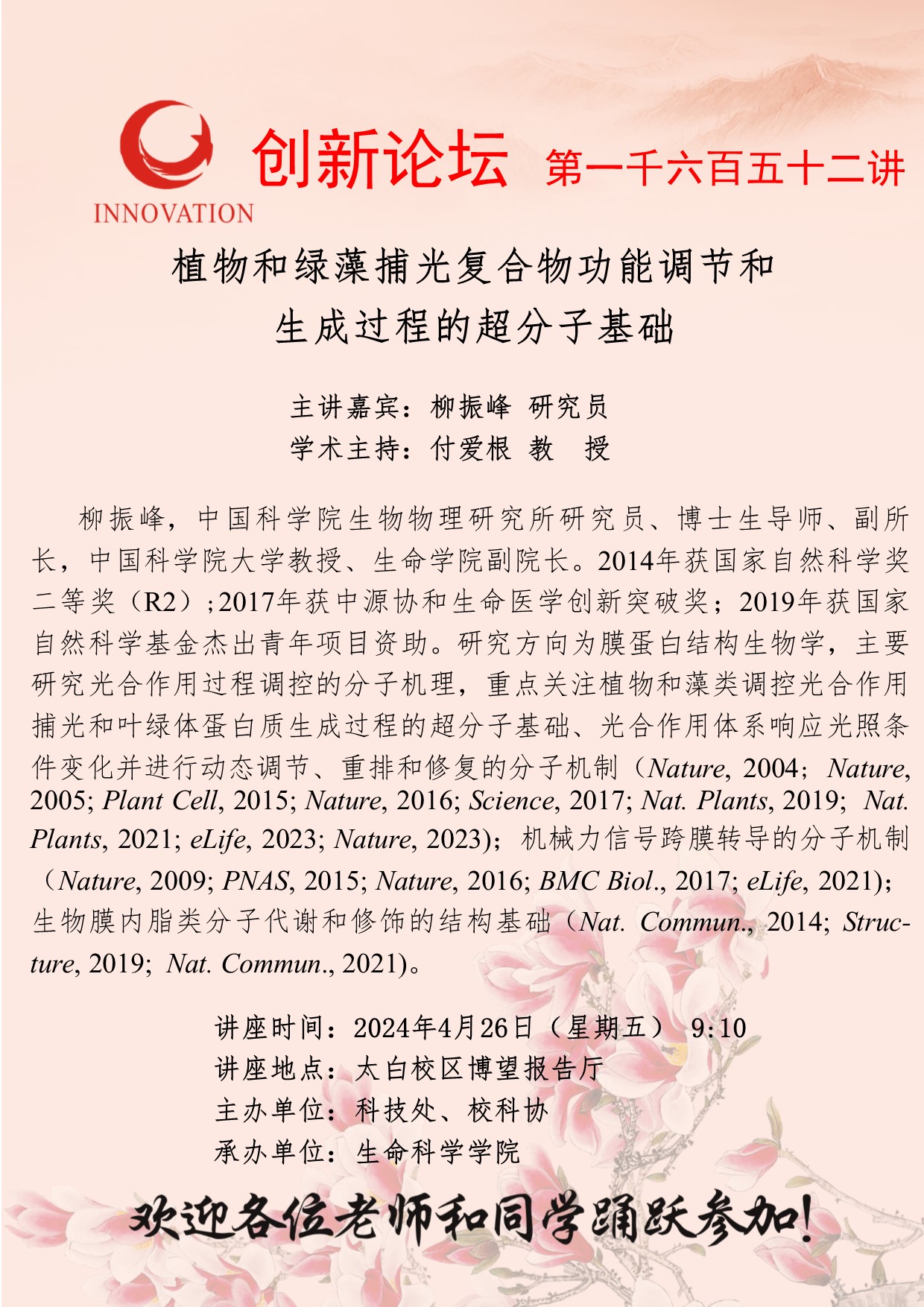 柳振峰 研究员 星空app官网创新论坛第一千六百五十二讲:植物和绿藻捕光复合物功能调节和生成过程的超分子基础 讲座时间 2024年4月26日(星期五) 9:10 讲座地点 太白校区博望报告厅 讲座人介绍 柳振峰 研究员 讲座内容