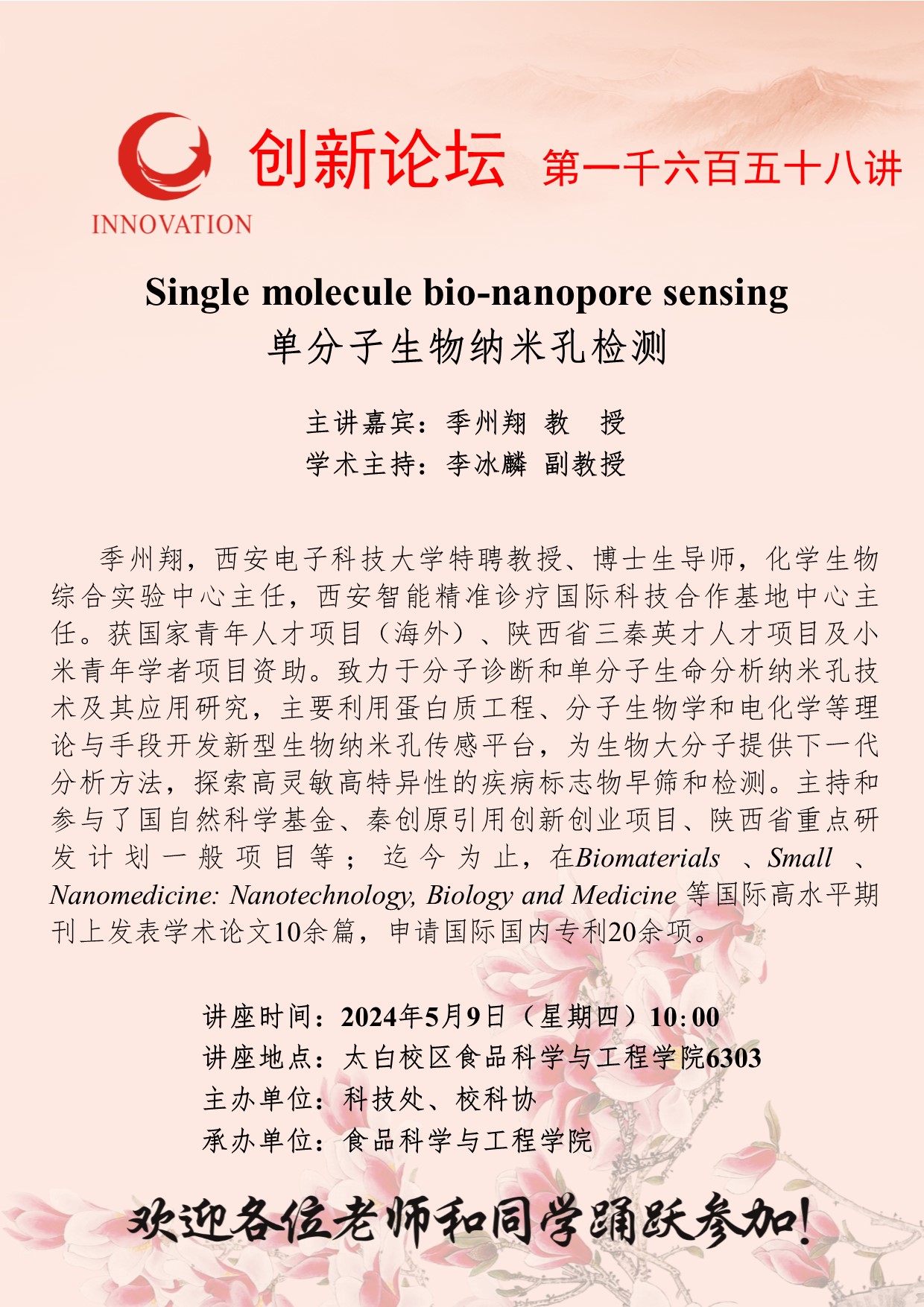 季州翔 教授 星空app官网创新论坛第一千六百五十八讲:Single molecule bio-nanopore sensing 讲座时间 2024年5月9日(星期四)10:00 讲座地点 太白校区食品科学与工程学院6303 讲座人介绍 季州翔 教授 讲座内容