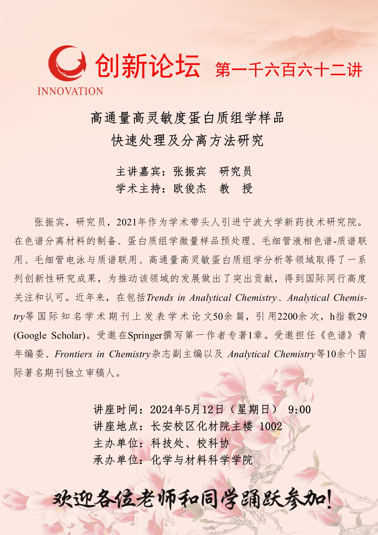 张振宾 研究员 星空app官网创新论坛第一千六百六十二讲:高通量高灵敏度蛋白质组学样品快速处理及分离方法研究 讲座时间 2024年5月12日(星期日) 9:00 讲座地点 长安校区化材院主楼 讲座人介绍 张振宾 研究员 讲座内容