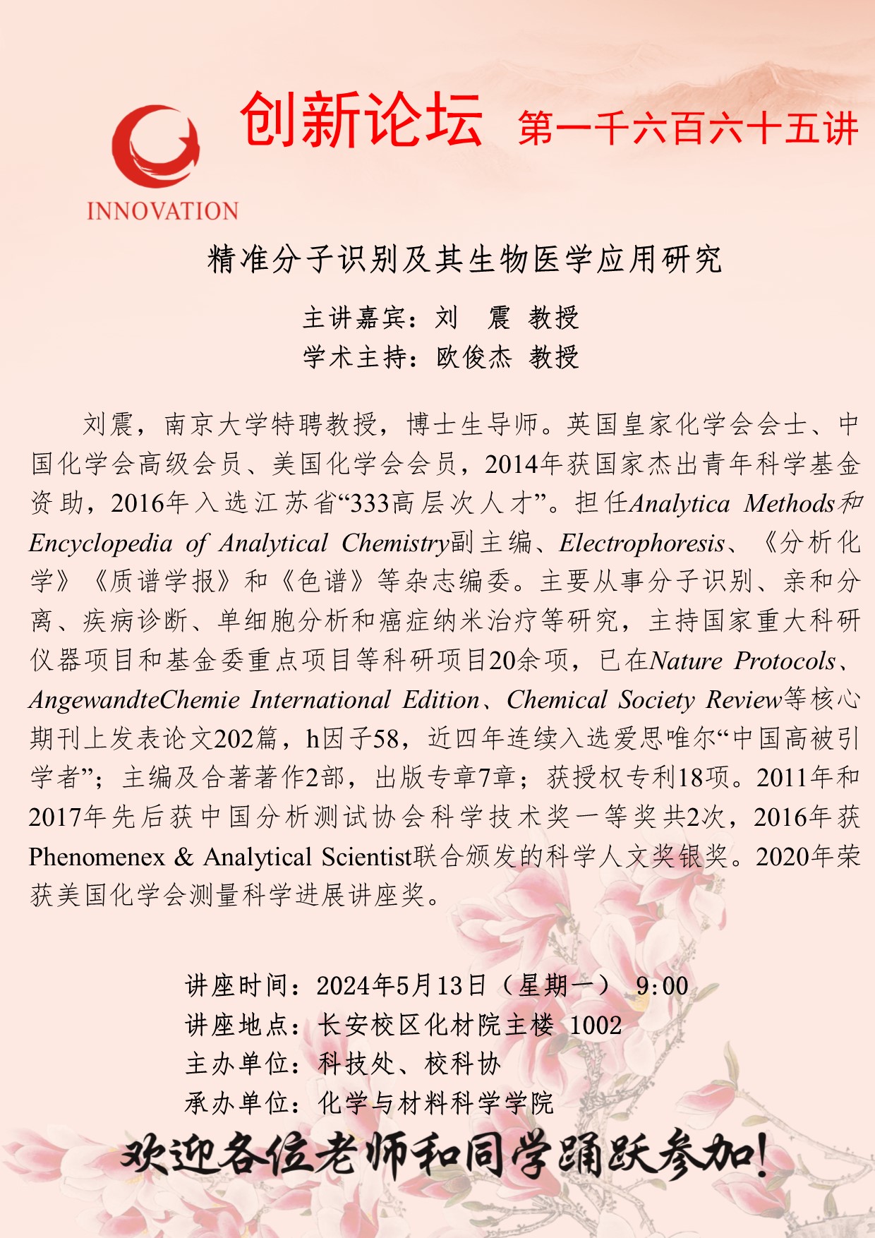 刘 震 教授 星空app官网创新论坛第一千六百六十五讲:精准分子识别及其生物医学应用研究 讲座时间 2024年5月13日(星期一) 9:00 讲座地点 长安校区化材院主楼 1002 室 讲座人介绍 刘 震 教授 讲座内容