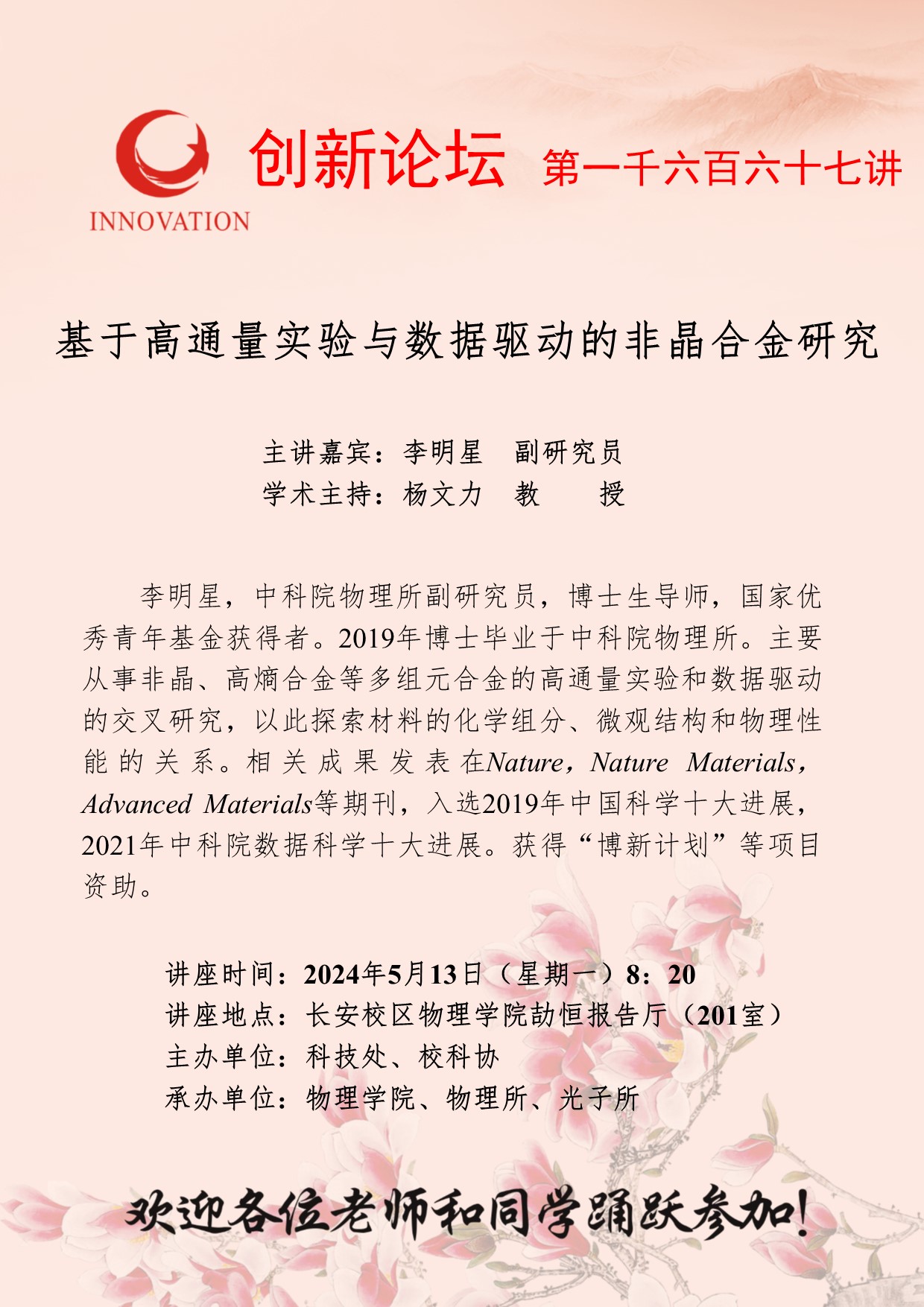 李明星 副研究员 星空app官网创新论坛第一千六百六十七讲:基于高通量实验与数据驱动的非晶合金研究 讲座时间 2024年5月13日(星期一)8:20 讲座地点 长安校区物理学院劼恒报告厅(201室) 讲座人介绍 李明星 副研究员 讲座内容