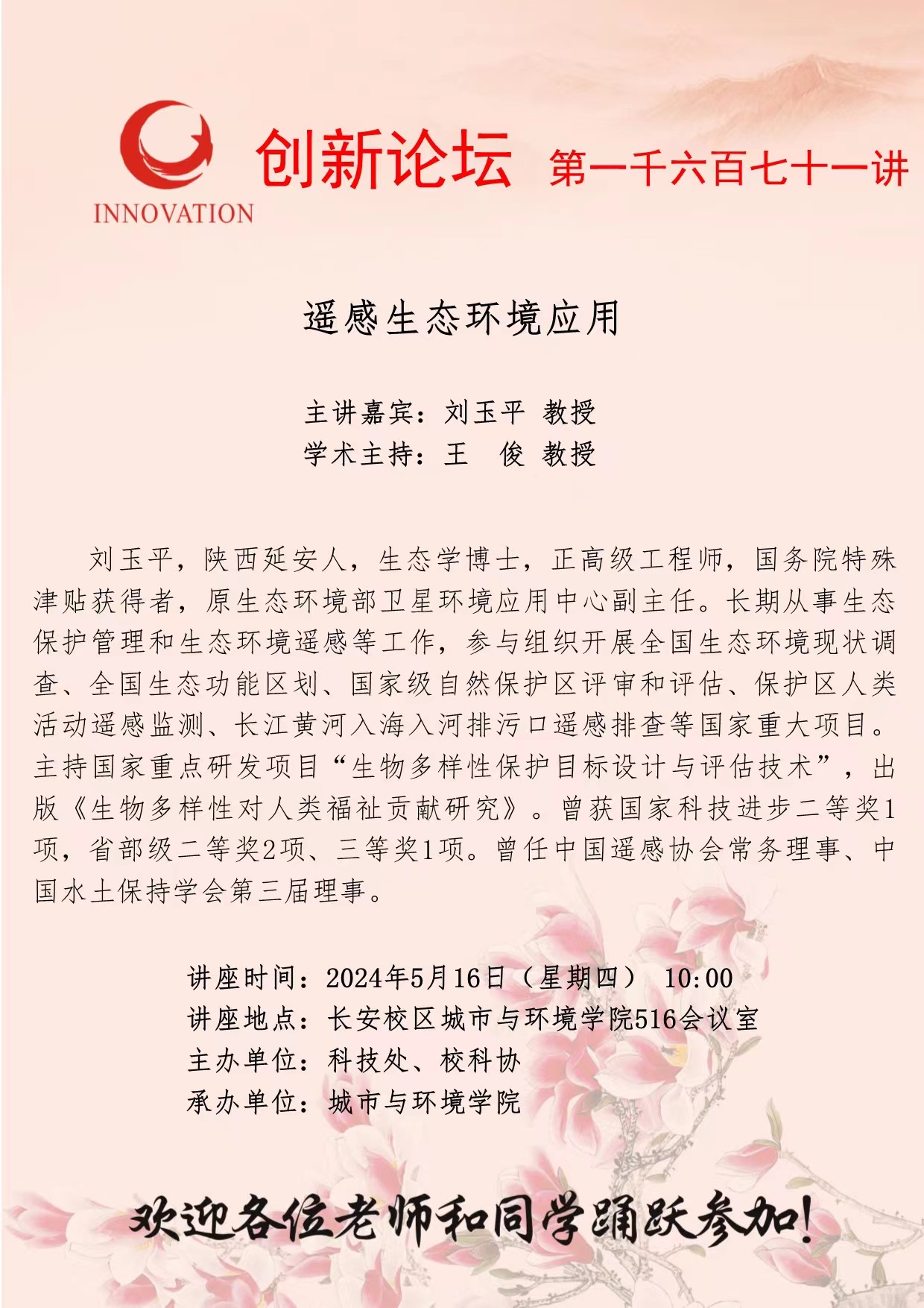 刘玉平 教授 星空app官网创新论坛第一千六百七十一讲:遥感生态环境应用 讲座时间 2024年5月16日(星期四) 10:00 讲座地点 长安校区城市与环境学院516会议室 讲座人介绍 刘玉平 教授 讲座内容