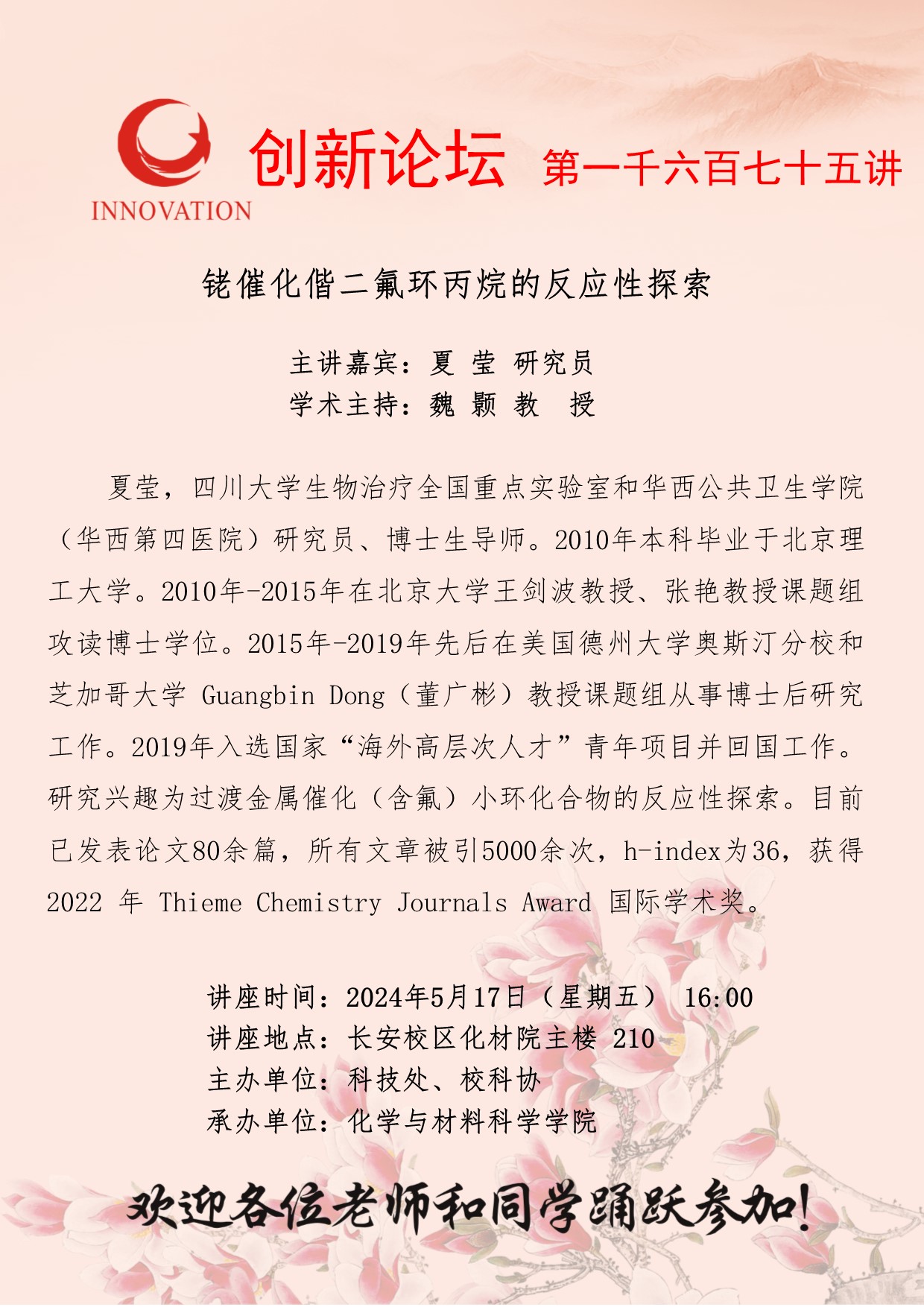 夏莹 研究员 星空app官网创新论坛第一千六百七十五讲:铑催化偕二氟环丙烷的反应性探索 讲座时间 2024年5月17日(星期五) 16:00 讲座地点 长安校区化材院主楼 210 讲座人介绍 夏莹 研究员 讲座内容