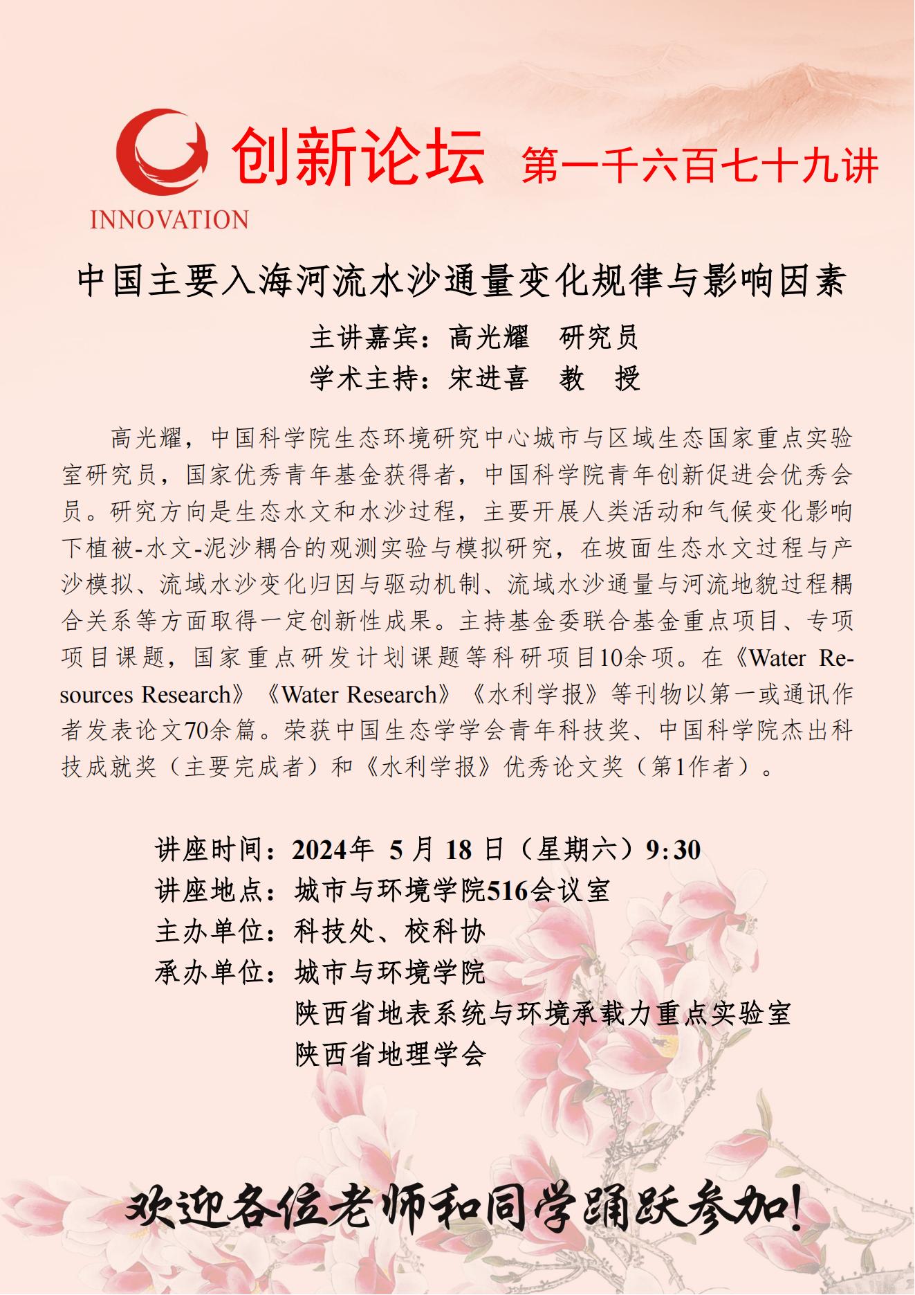 高光耀 研究员 星空app官网创新论坛第一千六百七十九讲:中国主要入海河流水沙通量变化规律与影响因素 讲座时间 2024年5月18日(星期六)9:30 讲座地点 城市与环境学院516会议室 讲座人介绍 高光耀 研究员 讲座内容
