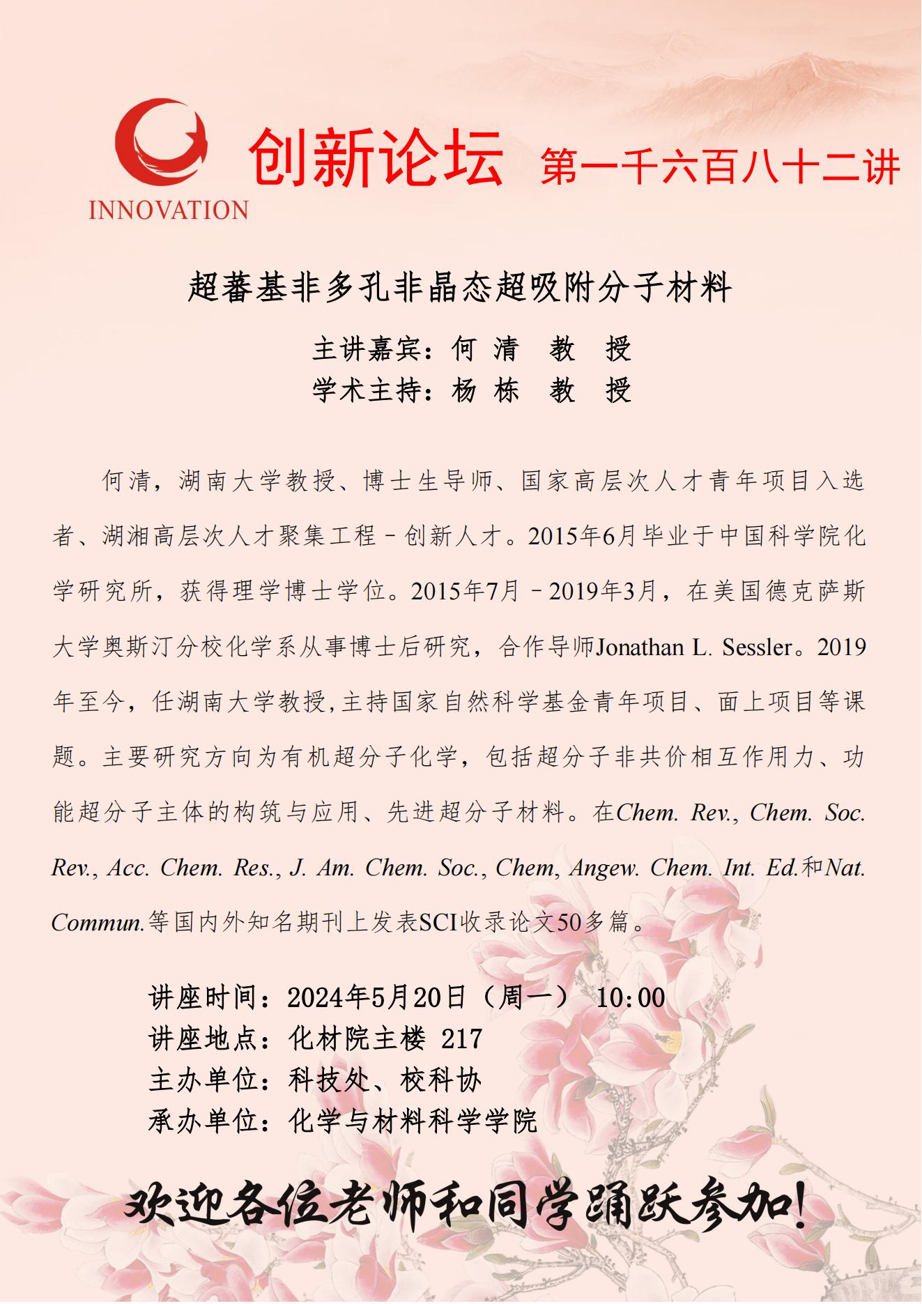 何清 教授 星空app官网创新论坛第一千六百八十二讲:超蕃基非多孔非晶态超吸附分子材料 讲座时间 2024年5月20日(星期一) 10:00 讲座地点 长安校区化材院主楼 217 讲座人介绍 何清 教授 讲座内容