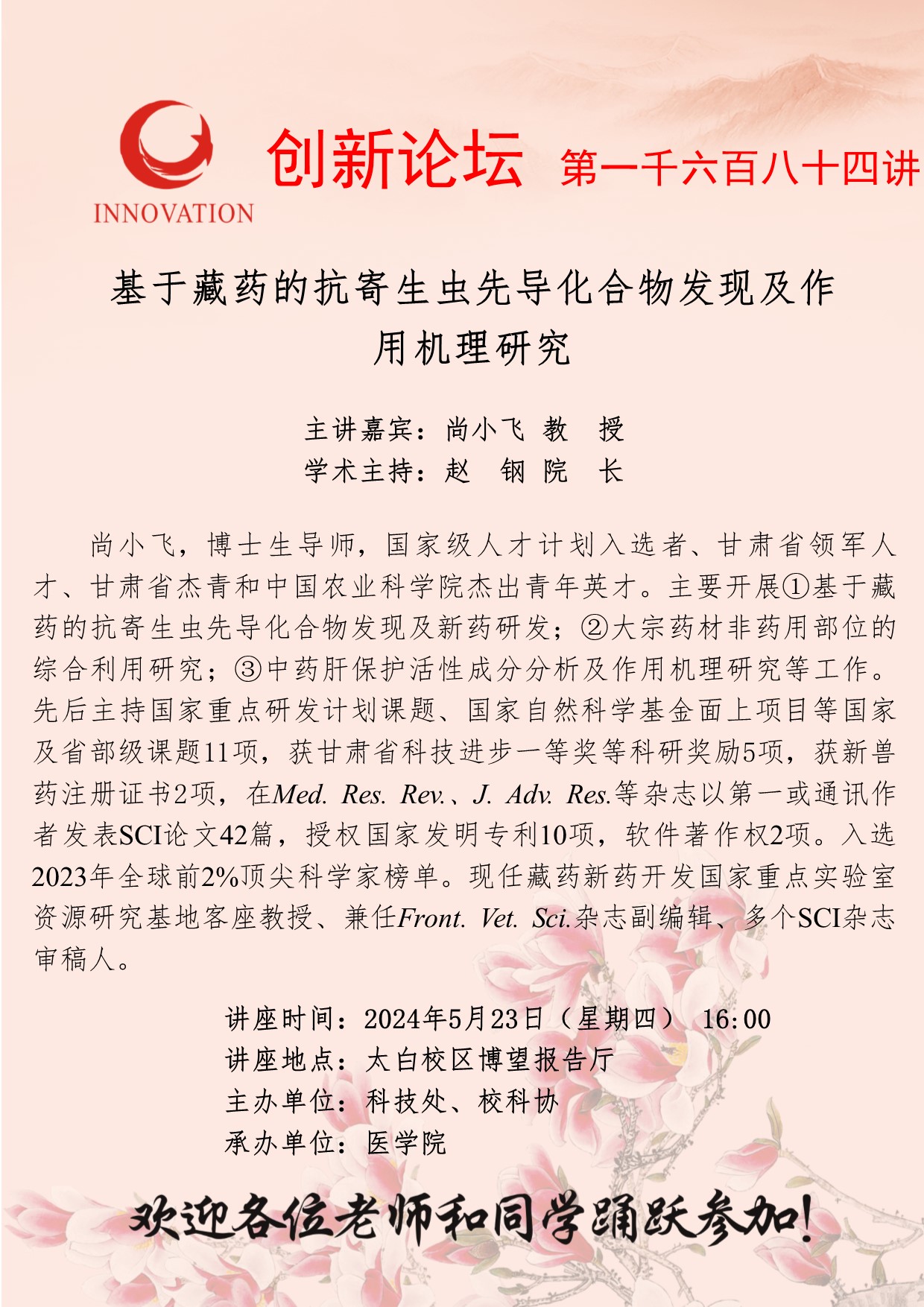 尚小飞 教授 星空app官网创新论坛第一千六百八十四讲:基于藏药的抗寄生虫先导化合物发现及作用机理研究 讲座时间 2024年5月23日(星期四) 16:00 讲座地点 太白校区博望报告厅 讲座人介绍 尚小飞 教授 讲座内容