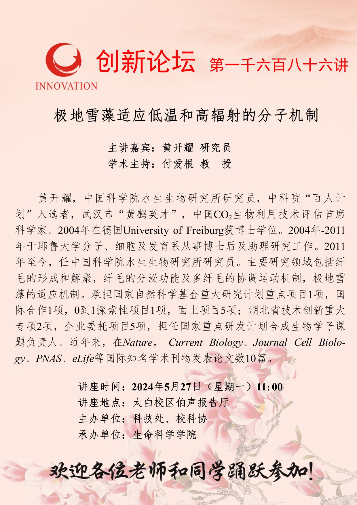 黄开耀 研究员 星空app官网创新论坛第一千六百八十六讲:极地雪藻适应低温和高辐射的分子机制 讲座时间 2024年5月27日(星期一)11:00 讲座地点 太白校区伯声报告厅 讲座人介绍 黄开耀 研究员 讲座内容