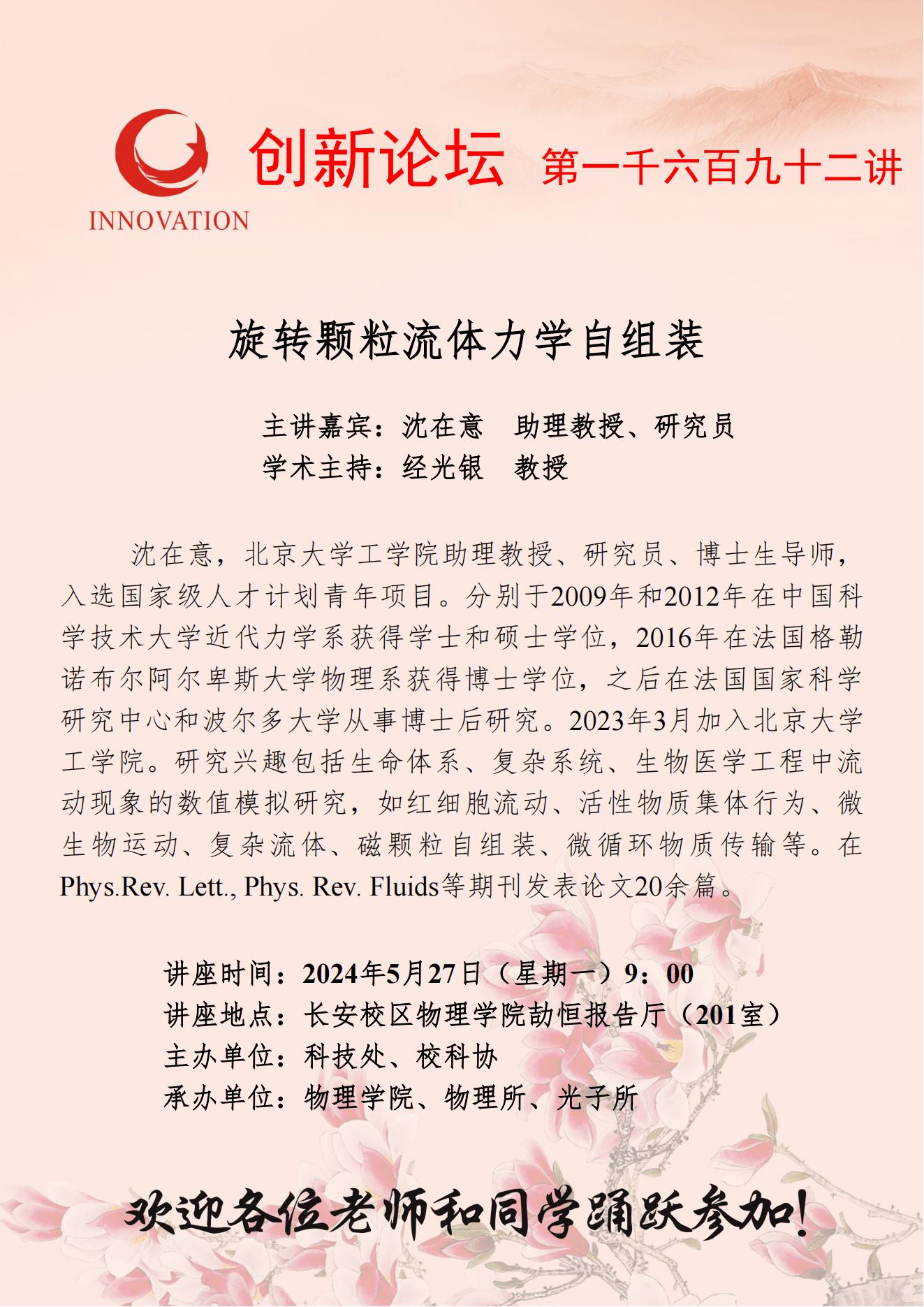 沈在意 助理教授、研究员 星空app官网创新论坛第一千六百九十二讲:旋转颗粒流体力学自组装 讲座时间 2024年5月27日(星期一)9:00 讲座地点 长安校区物理学院劼恒报告厅(201室) 讲座人介绍 沈在意 助理教授、研究员 讲座内容