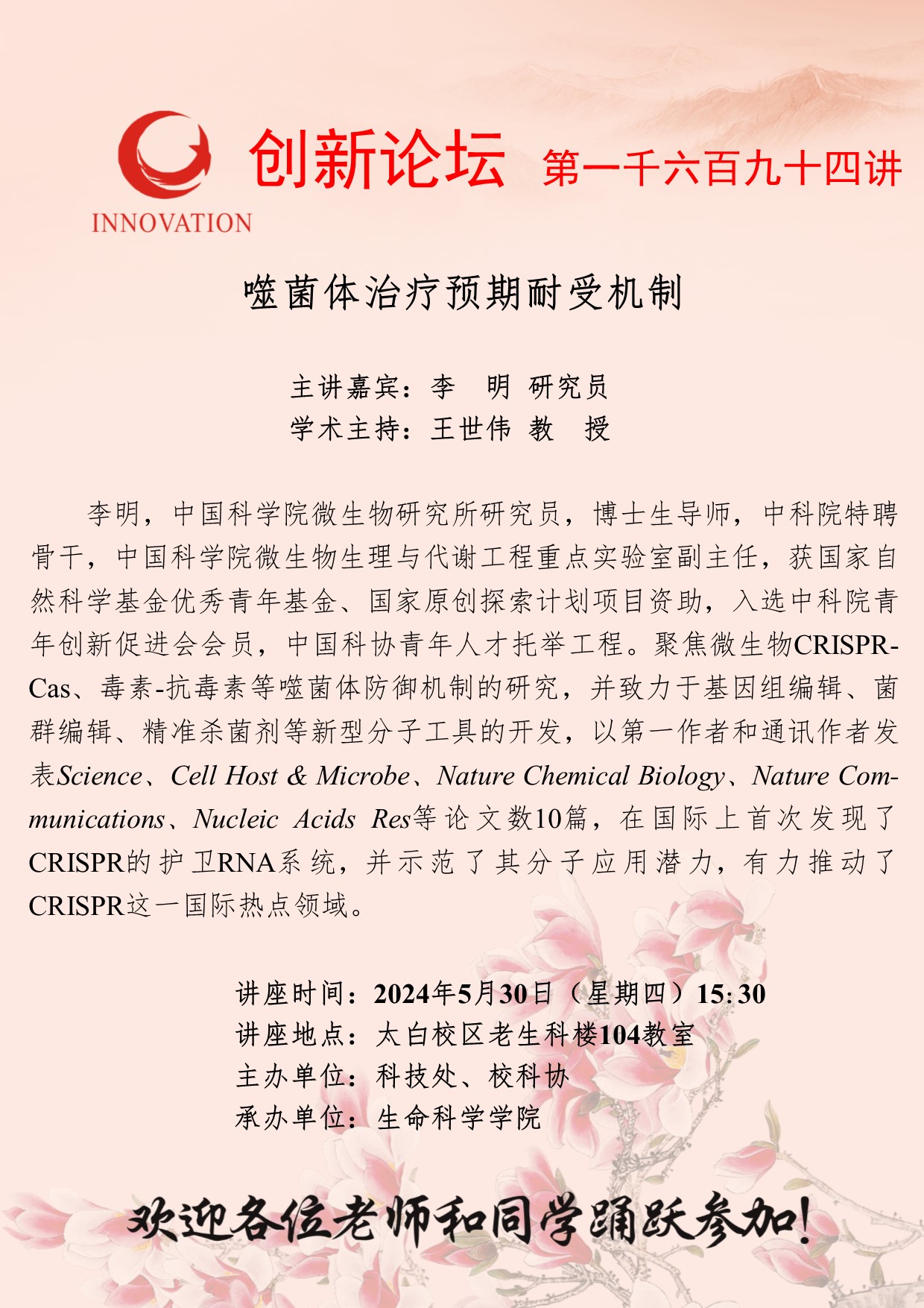 李明 研究员 星空app官网创新论坛第一千六百九十四讲:噬菌体治疗预期耐受机制 讲座时间 2024年5月30日(星期四)15:30 讲座地点 太白校区老生科楼104教室 讲座人介绍 李明 研究员 讲座内容