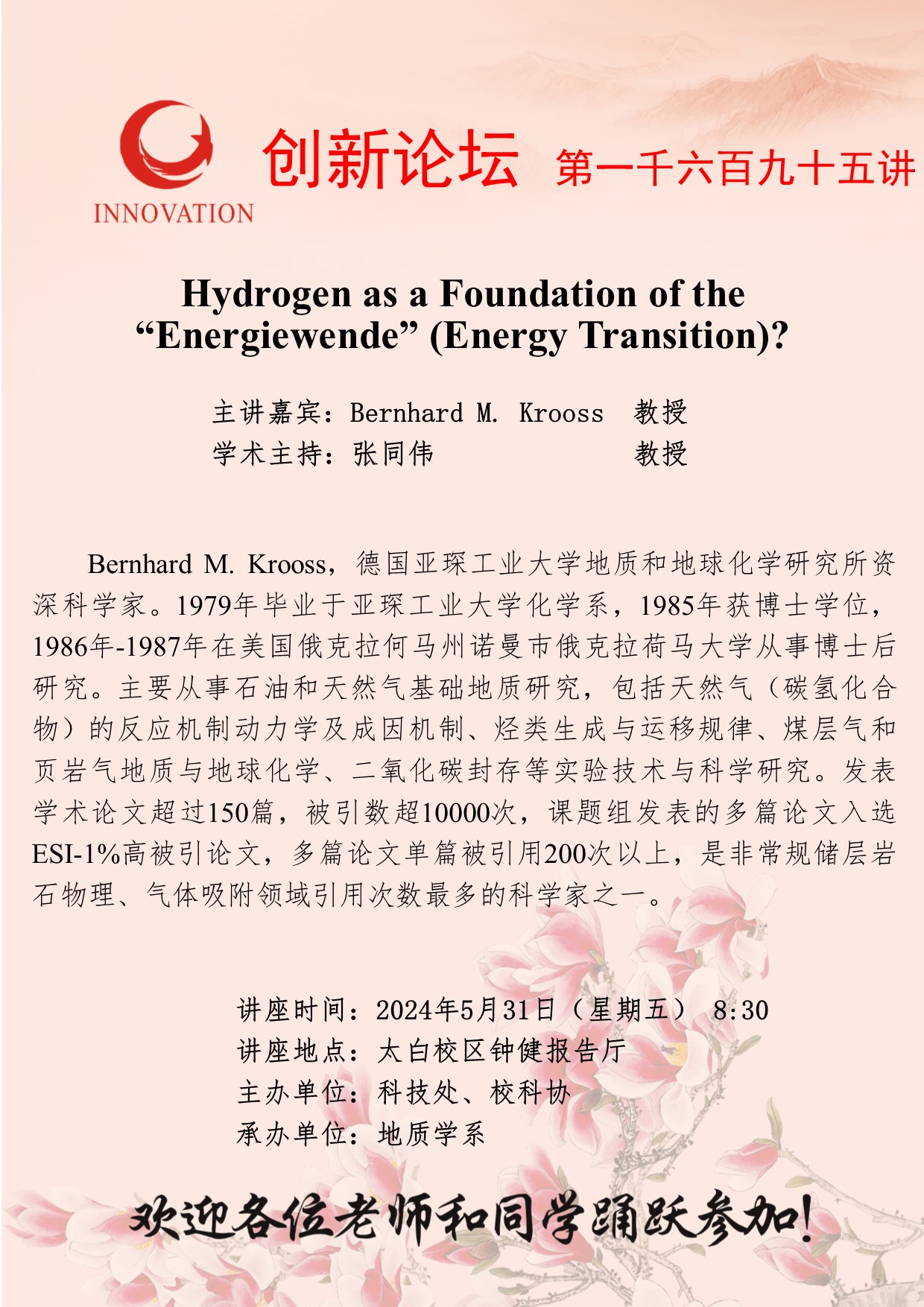 Bernhard M. Krooss 教授 星空app官网创新论坛第一千六百九十五讲:Hydrogen as a Foundation of the “Energiewende” (Energy Transition)? 讲座时间 2024年5月31日(星期五) 8:30 讲座地点 太白校区钟健报告厅 讲座人介绍 Bernhard M. Krooss 教授 讲座内容