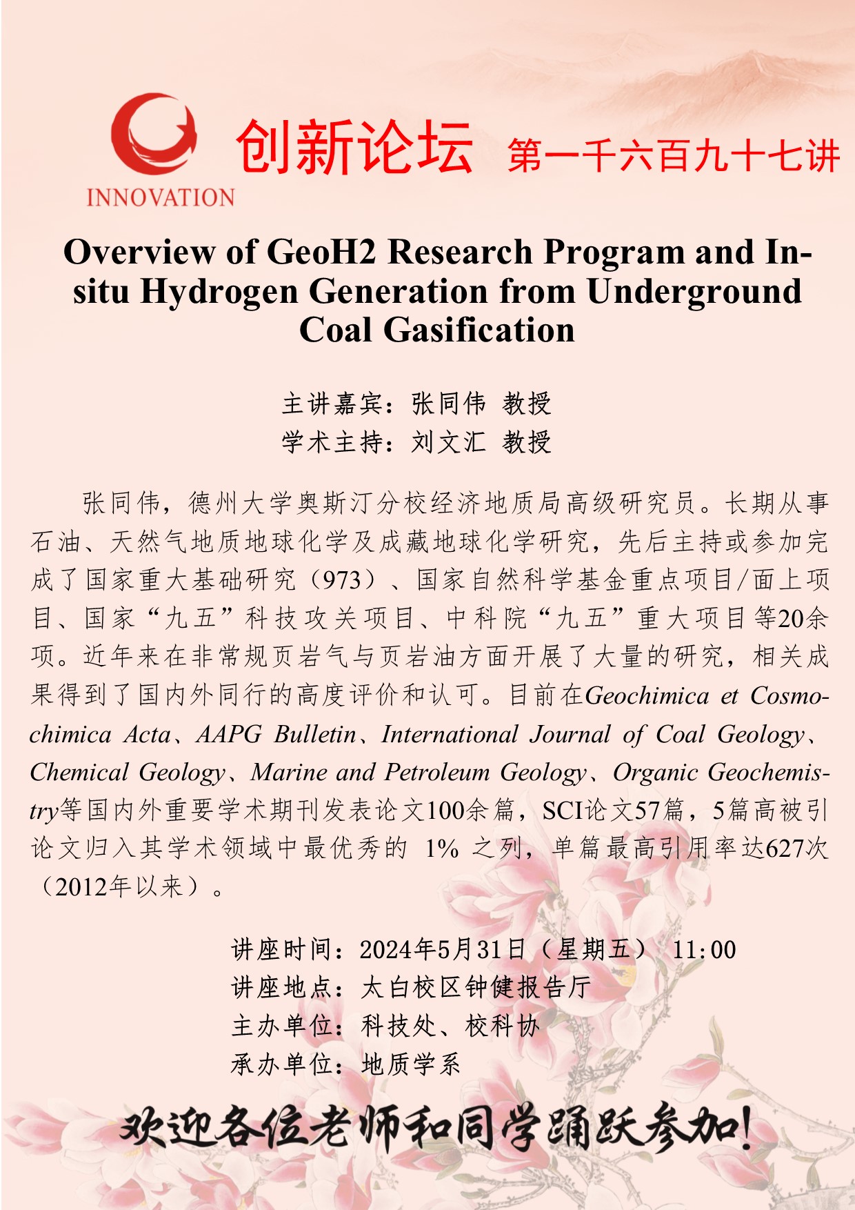 张同伟 教授 星空app官网创新论坛第一千六百九十七讲:Overview of GeoH2 Research Program and In-situ Hydrogen Generation from Underground Coal Gasification 讲座时间 2024年5月31日(星期五) 11:00 讲座地点 太白校区钟健报告厅 讲座人介绍 张同伟 教授 讲座内容