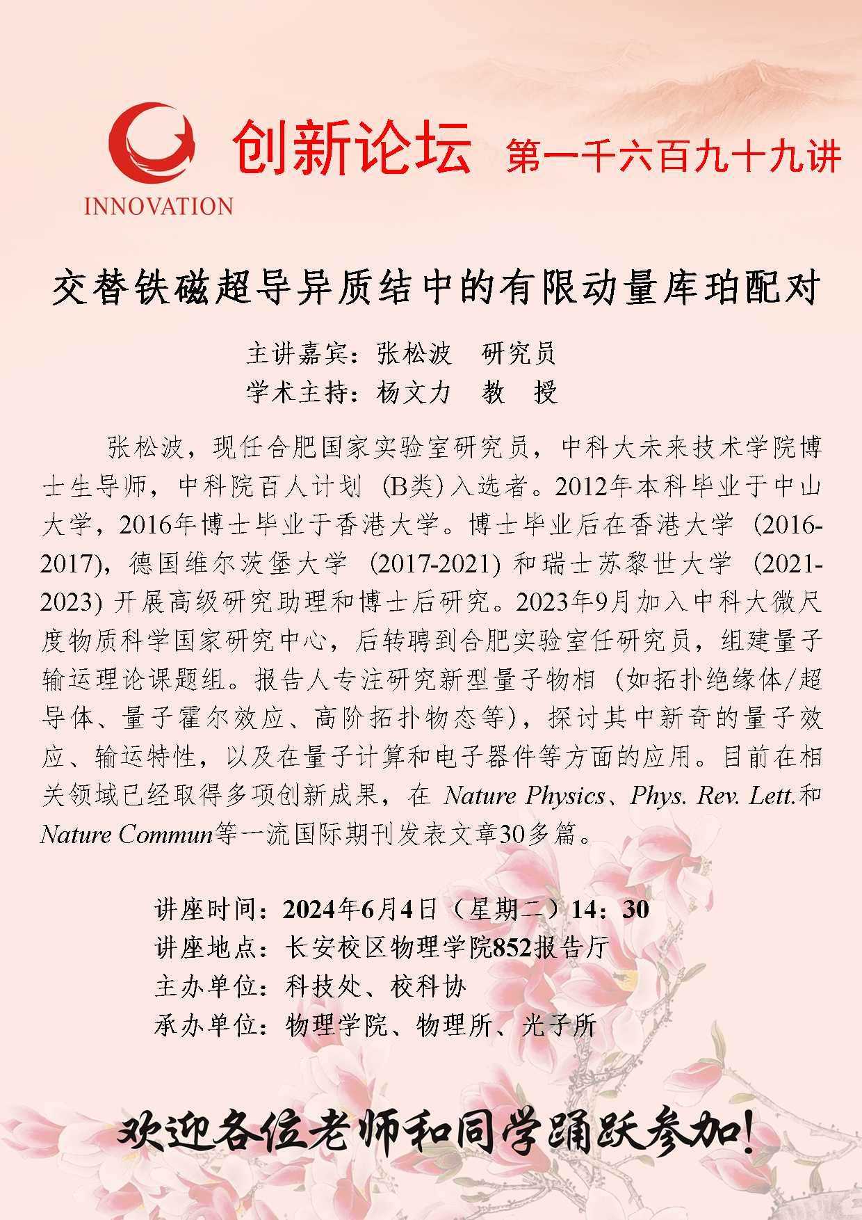 张松波 研究员 星空app官网创新论坛第一千六百九十九讲:交替铁磁超导异质结中的有限动量库珀配对 讲座时间 2024年6月4日(星期二)14:30 讲座地点 长安校区物理学院852报告厅 讲座人介绍 张松波 研究员 讲座内容