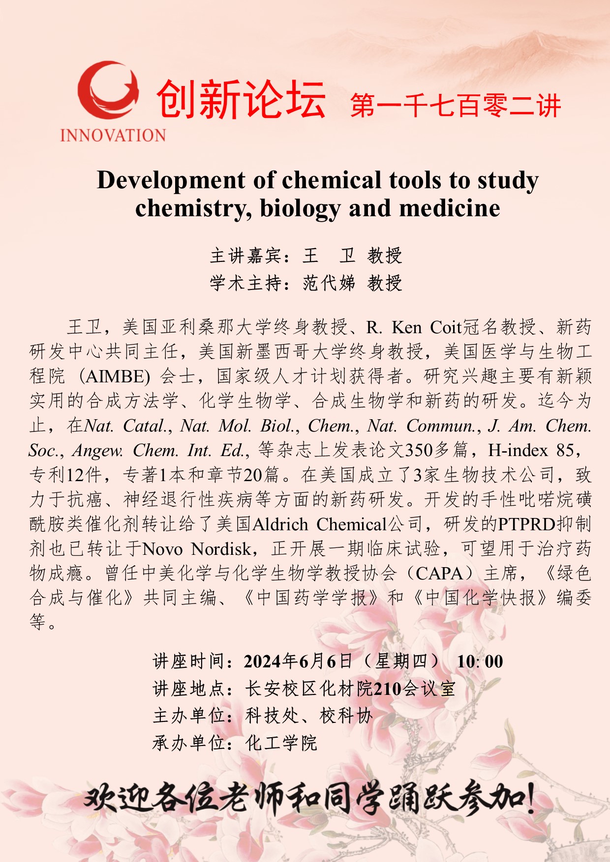 王卫 教授 星空app官网创新论坛第一千七百零二讲:Development of chemical tools to study chemistry, biology and medicine 讲座时间 2024年6月6日(星期四) 10: 00 讲座地点 长安校区化材院210会议室 讲座人介绍 王卫 教授 讲座内容